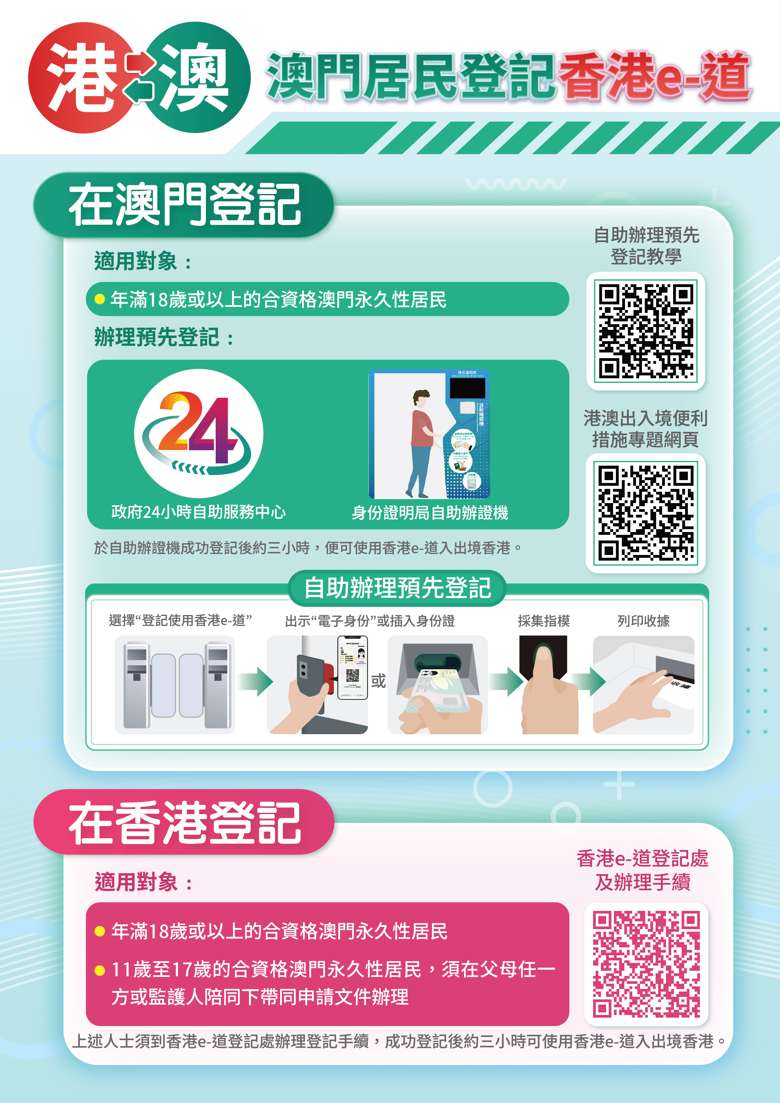 澳門居民如欲使用香港e-道通關,年滿18歲的澳門永久性居民可於澳門7個政府24小時自助服務中心的自助辦證機,以及橫琴粵澳深度合作區政務服務中心24小時自助服務區的“澳證易”自助辦證機進行登記,亦可前往香港e-道登記處辦理。自助辦證機設置地點請參閱政府24小時自助服務中心專頁(www.dsi.gov.mo/eservice),香港e-道登記處地點請參閱香港入境事務處網頁(https://www.immd.gov.hk/hkt/services/echannel_visitors.html#macao)。年滿11歲至17歲的澳門永久性居民必須在父/母或監護人陪同下,帶同申請文件親臨香港e-道登記處辦理。如已登記香港e-道,但因遺失身份證而換領新證或更改身份證資料(如:姓名、出生日期等)而換領身份證者,在取得新證後必須重新辦理登記手續。