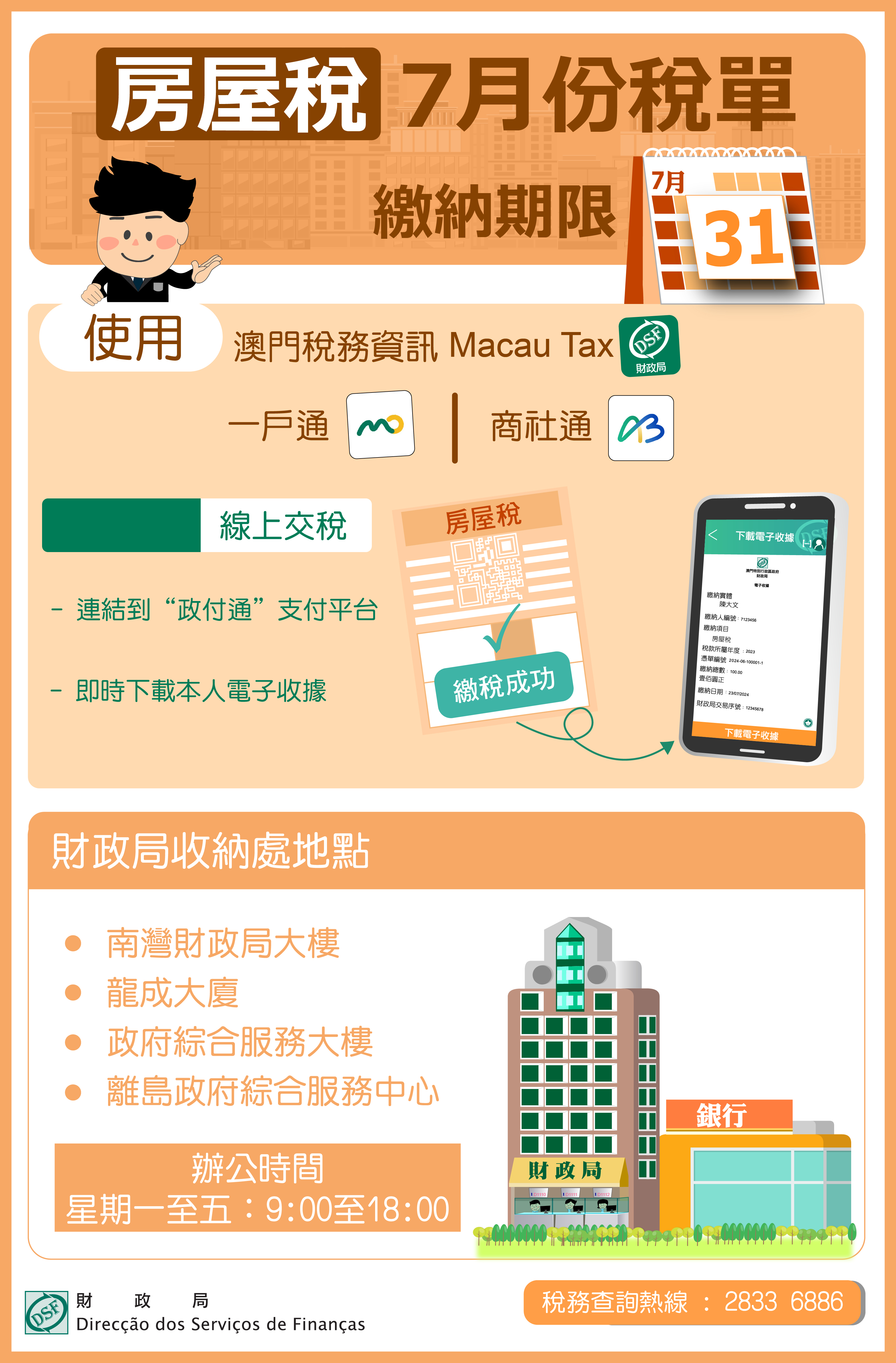 財政局提醒房屋稅納稅人,2023年度房屋稅徵稅憑單上繳納月份屬7月的房屋稅,繳納期限至7月31日屆滿,仍未繳納上述房屋稅的納稅人應儘快繳納,避免因逾期繳納而須附加過期利息和罰款。