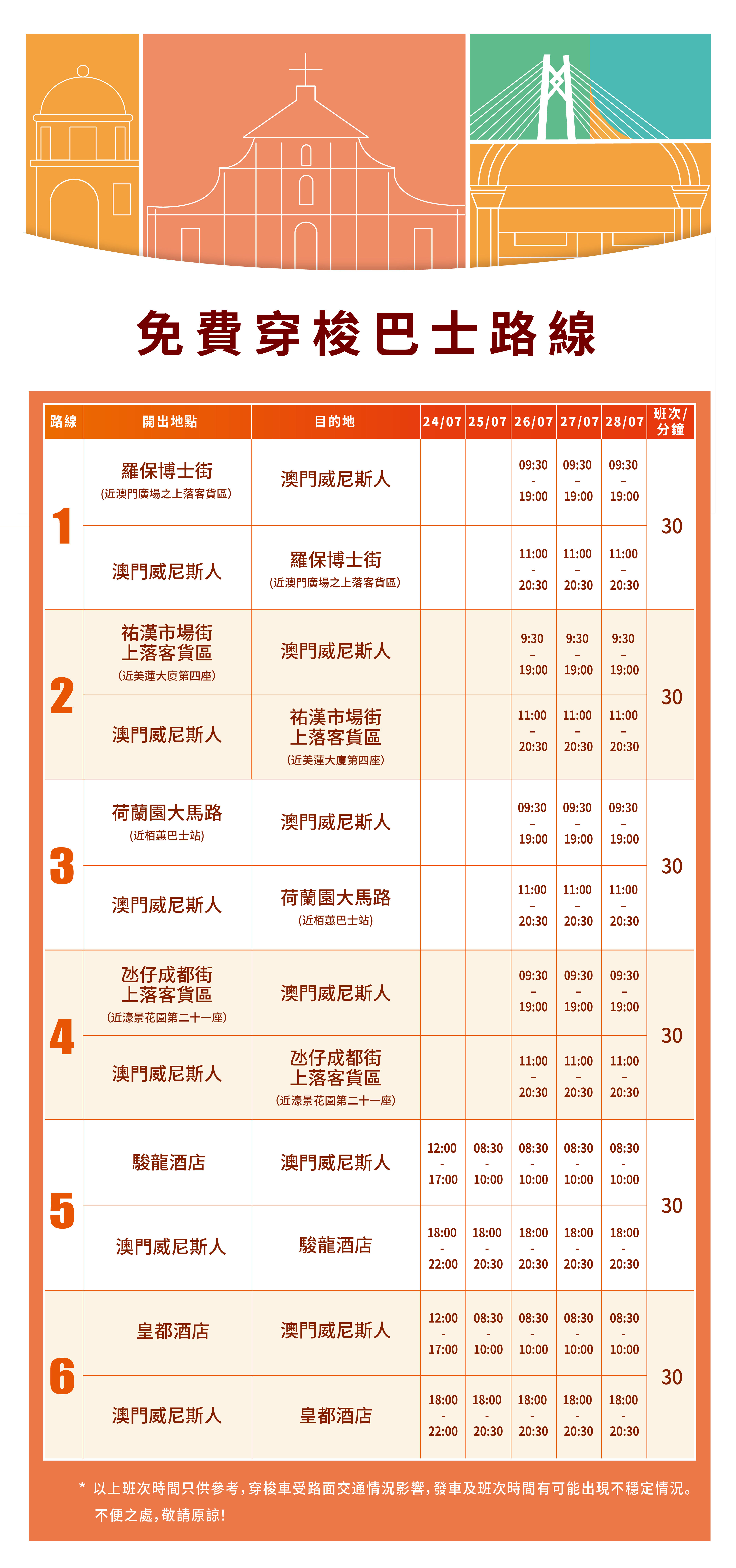 “2024粵澳名優商品展”由澳門特別行政區招商投資促進局、廣東省商務廳合辦。7月25日(周四,專業觀眾日)的開放時間為11:00至18:30;7月26至28日(周五至周日)開放時間為10:00至20:00。大會於澳門及氹仔設六條免費接駁巴士線往來活動場地。