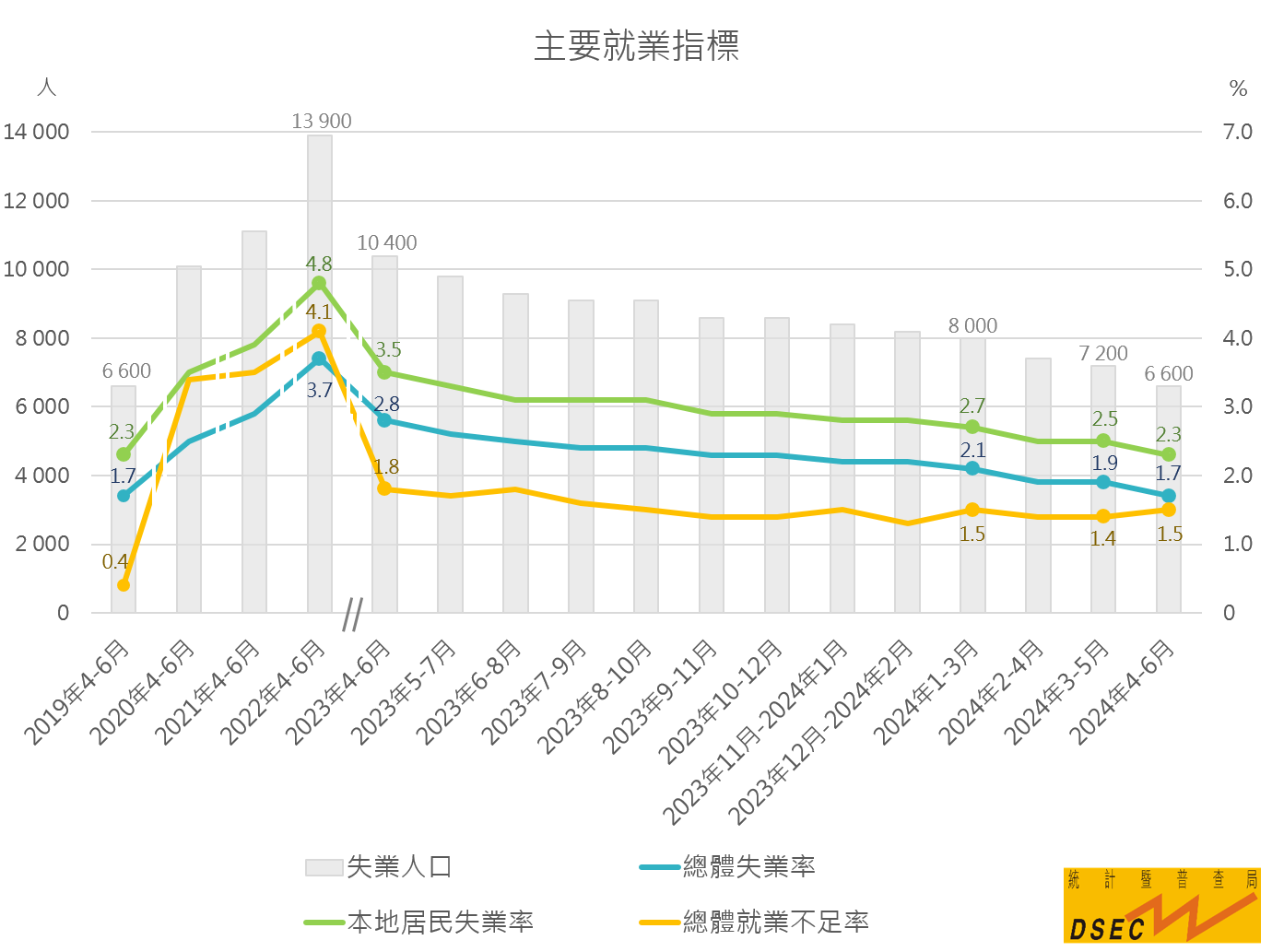 統計暨普查局資料顯示,2024年第2季總體失業率(1.7%)及本地居民失業率(2.3%)按季均下跌0.4個百分點,並已回復至2019年第2季水平;就業不足率(1.5%)則持平。