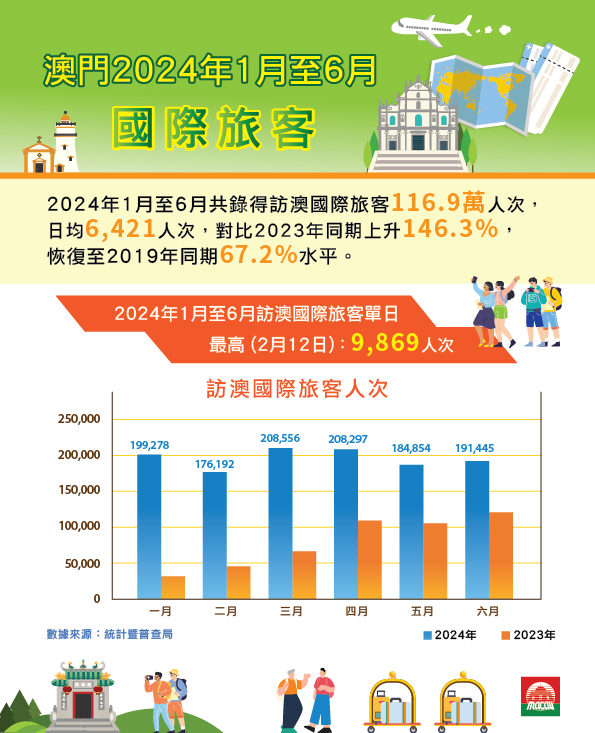 根據統計暨普查局公佈的資料顯示,澳門今年上半年入境旅客共超過1,600萬人次,較去年同期上升43.6%,而訪澳國際旅客有近117萬人次,同比上升146.3%,復甦情況同樣顯著。今年上半年的隨團入境旅客有96.8萬人次,按年上升1.7倍;國際團客增加8.4倍至10.2萬人次,顯示團隊遊對旅客具吸引力。