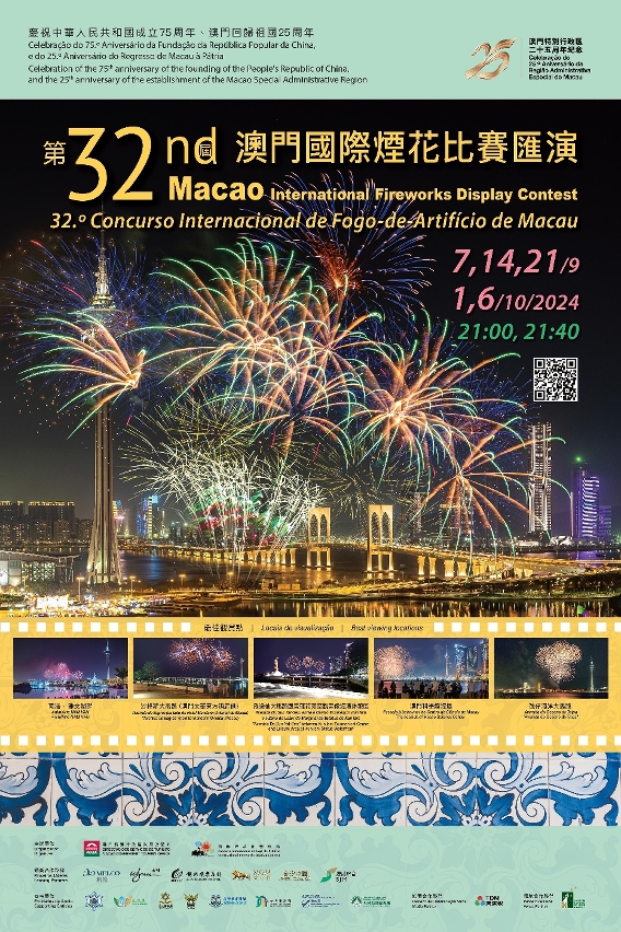 由旅遊局主辦的慶祝中華人民共和國成立75周年、澳門回歸祖國25周年 第32屆澳門國際煙花比賽匯演將於9月7日至10月6日期間舉行。來自世界各地10個國家的煙花公司將為居民和旅客傾力炮製送上精彩演出,豐富夜間活動,帶動澳門社區經濟。