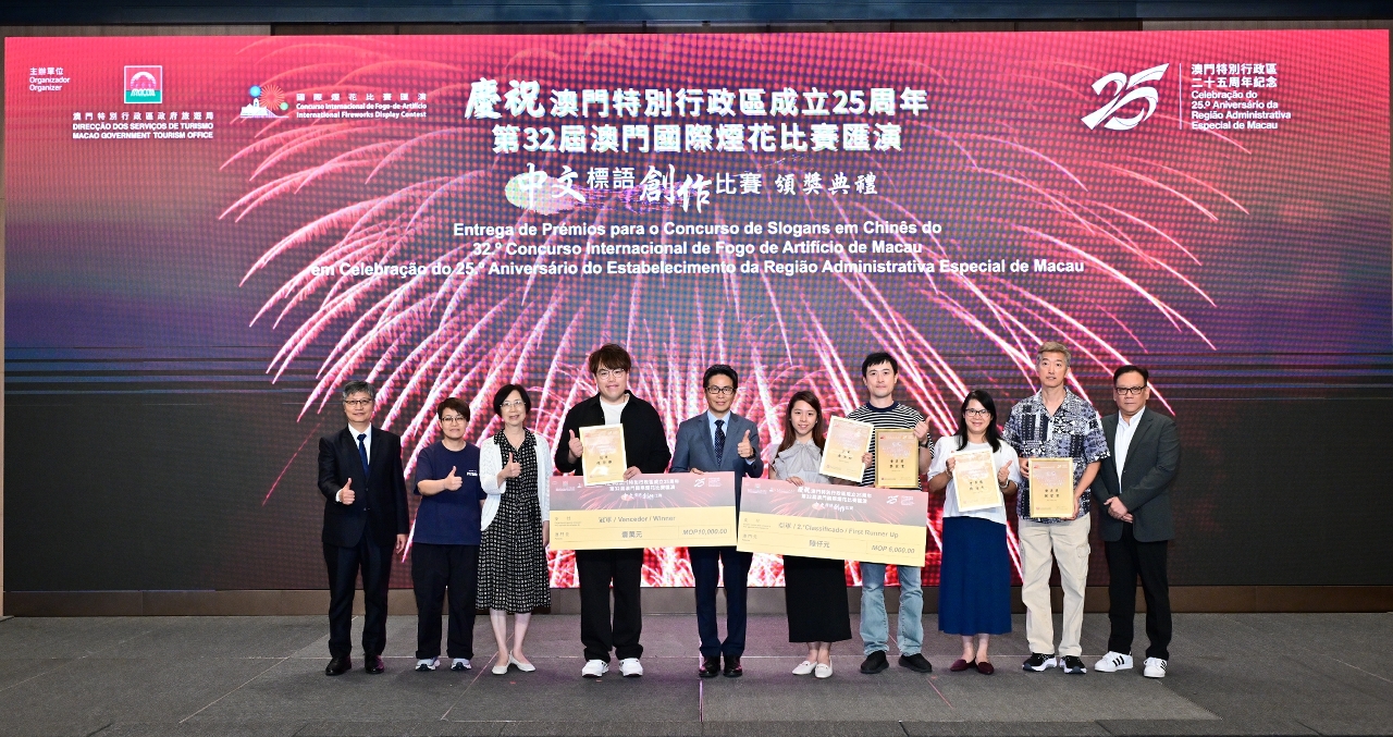 年度盛事活動“慶祝中華人民共和國成立75周年、澳門回歸祖國25周年 第32屆澳門國際煙花比賽匯演”於今(28日)舉行新聞發佈會,同場舉行中文標語創作比賽頒獎典禮,公佈得獎結果並頒發獎項。