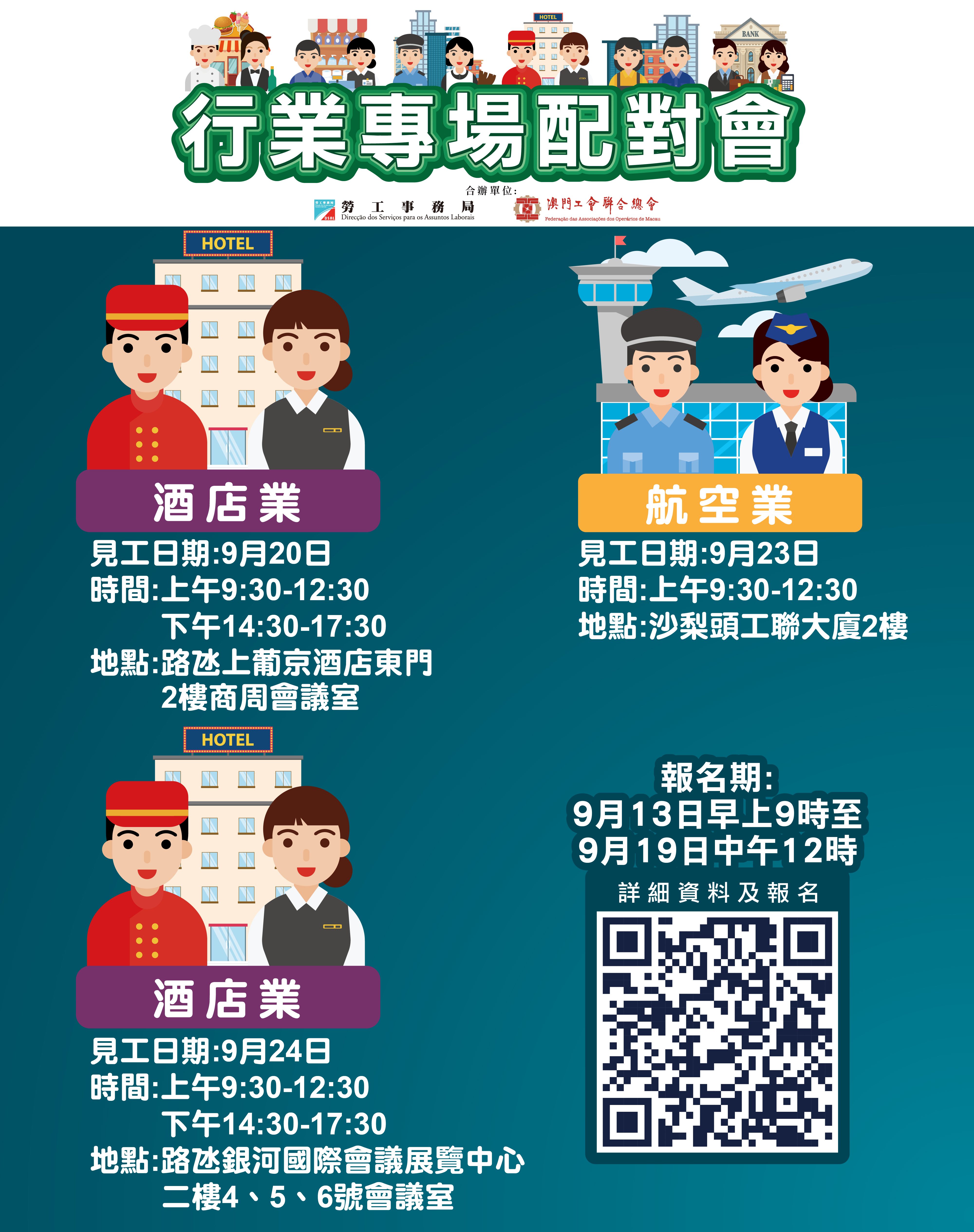 9月23日上午舉辦航空業配對會,提供85個職位空缺,涉及機場安檢員。配對會在澳門工會聯合總會2樓(沙梨頭海邊街2-6號工聯大廈)舉行。