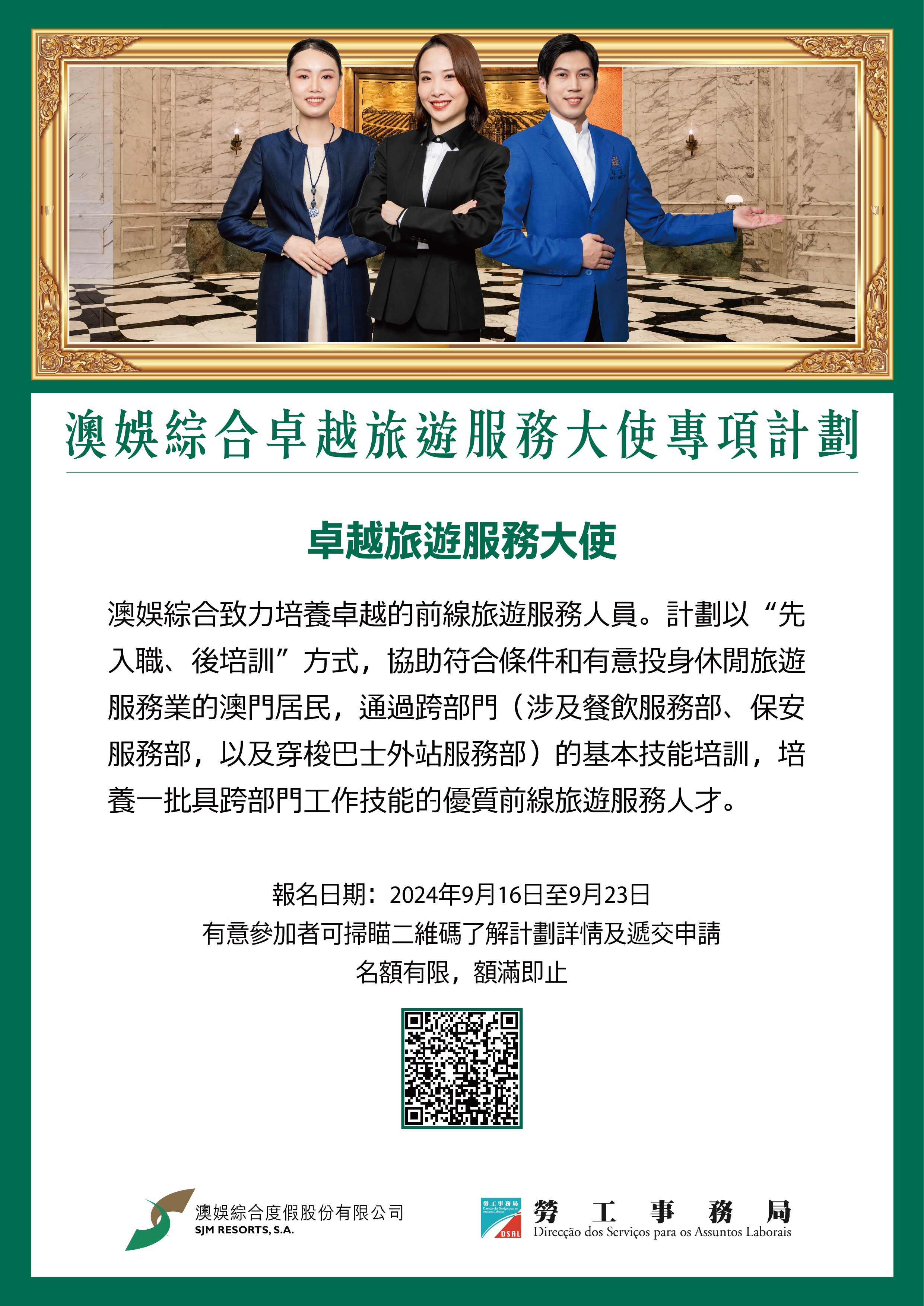 為支持本地人才全面發展,拓展多元職涯路向,勞工事務局與澳娛綜合度假股份有限公司(下稱“澳娛綜合")合作推出“澳娛綜合卓越旅遊服務大使專項計劃"(下稱“計劃"),以“先入職、後培訓”方式,為有志投身綜合旅遊休閒服務行業的澳門居民提供全方位培訓及事業發展機會,計劃由9月16日起接受申請。