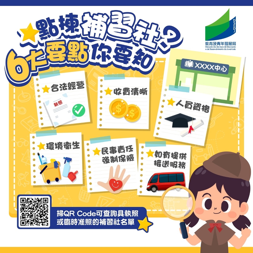 教青局再次呼籲家長為子女選擇補習社時,首要選擇合法經營的補習社,事前須充分了解和仔細評估各補習社的服務內容、場所環境及收費,有助篩選出更適合子女的補習社。