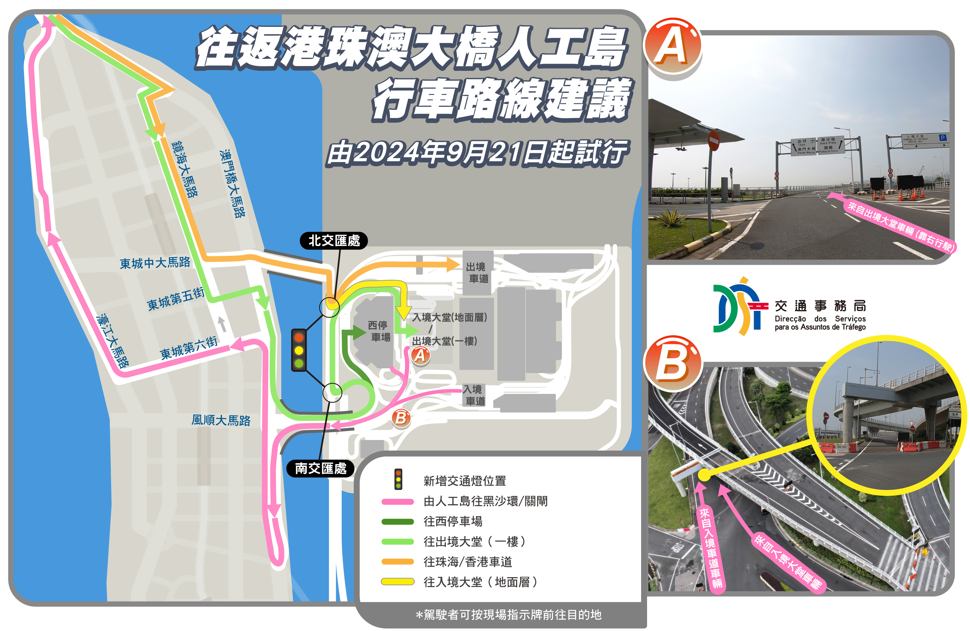 配合澳門大橋即將通車,連接新城A區與港珠澳大橋澳門口岸管理區(下稱“人工島”)之間的風順大馬路口岸人工島連接橋路段將於9月21日(周六)率先啟用,並會於同日調整A區往返人工島之行車路線,以及於港珠澳口岸環形馬路南、北交匯處增設兩組交通訊號燈。交通事務局期望措施有助分流車輛,提升通行效率和改善車流交織情況。