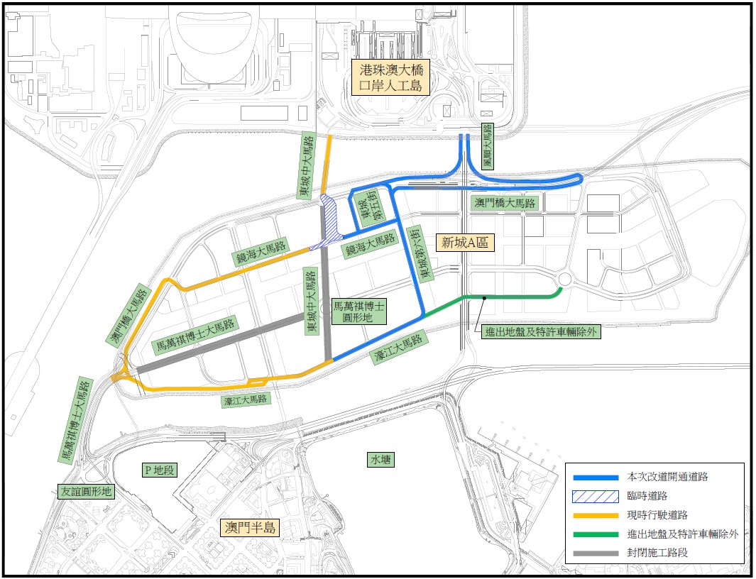 自2024年9月21日起,為開展東城中大馬路(原名:豚城大馬路)地下共同管道的施工,往來港珠澳大橋口岸人工島的車輛須取道旁邊的臨時道路,與此同時,新建的鏡海大馬路、東城第五街、東城第六街、風順大馬路、澳門橋大馬路及濠江大馬路的部分路段也同步開通,增加道路往來港珠澳大橋口岸,以加強疏導口岸車流,並提前為後續澳門大橋通車做好準備。
