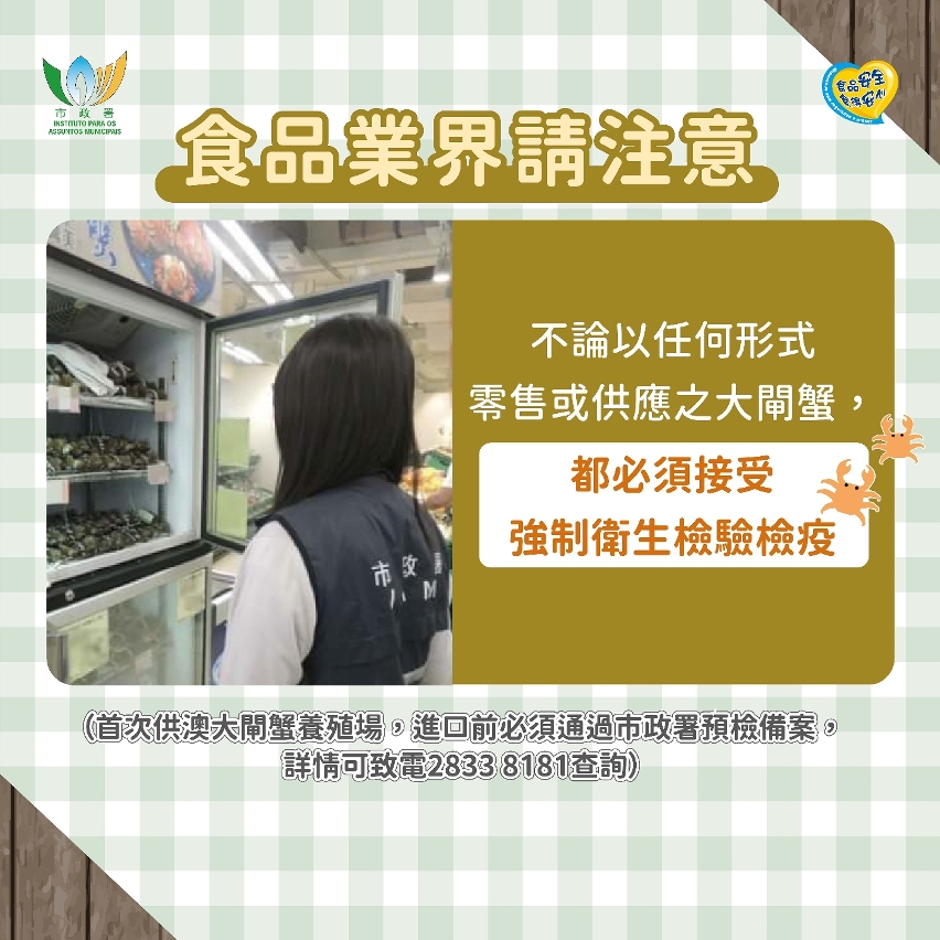 市政署持續透過嚴格的入口檢驗檢疫制度及市場巡查機制,對入口並在本澳銷售的鮮活食品作嚴格把關。市政署與內地權限部門保持緊密聯繫,對供澳大閘蟹的品質及安全,採取源頭監管直接供澳措施。大閘蟹養殖場正式供貨到澳門前,須通過市政署預檢,並由來源場監管當局直接封簽才可輸澳。而大閘蟹抵澳後亦須提交由產地官方發出之衛生證明文件以及相關衛生檢疫資料供審核,並接受常規抽樣,經檢驗檢疫程序後才得以流入本澳市場。