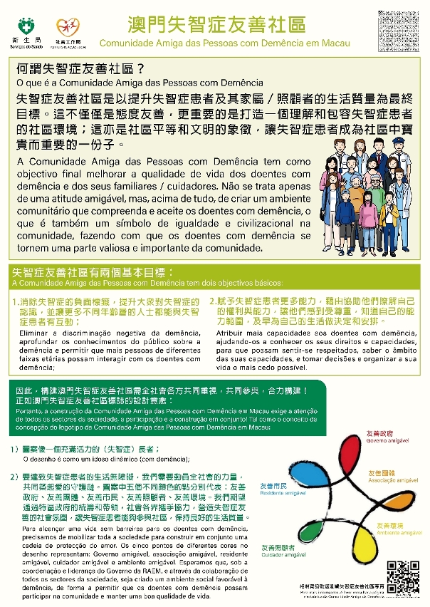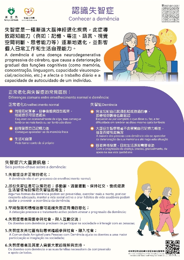 此外,衛生局聯同社會工作局、澳門失智症協會共同舉辦澳門特區失智症友善大聯盟交流會,邀請已加盟的高等院校、醫療專業團體、長者服務機構、青年服務機構及學校等代表作分享,促進彼此的交流與合作。衛生局亦製作了預防失智症宣傳片,並與社會工作局共同製作了多款相關宣傳海報。欲了解更多失智症資訊,歡迎瀏覽澳門失智症友善社區專頁(https://www.ssm.gov.mo/mdfc/)。