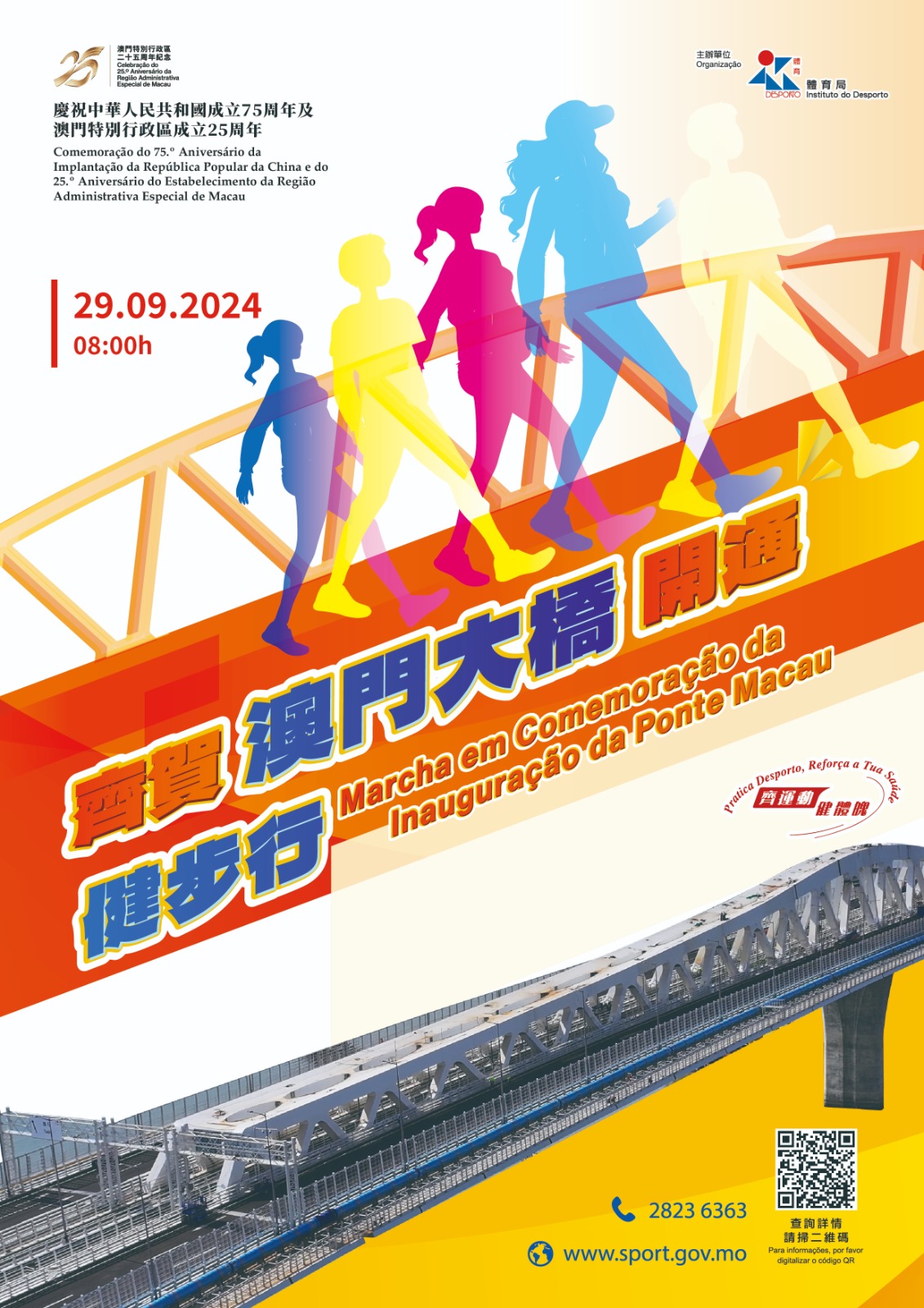 為熱烈慶祝中華人民共和國成立75周年及澳門特別行政區成立25周年,體育局將於9月29日,在澳門大橋開通前舉辦“齊賀澳門大橋開通健步行”。活動自9月19日報名以來,得到廣大市民的熱情參與,報名情況踴躍。體育局經與各相關部門會商,綜合評估後,將活動的參加名額由10,000個增加至17,000個。現時團體報名已結束,第一輪個人報名將於明(22)日上午10時至9月24日晚上9時進行,名額5,000;新增的第二輪個人報名則於9月24日上午10時至9月25日中午12時進行,名額7,000,額滿即止。