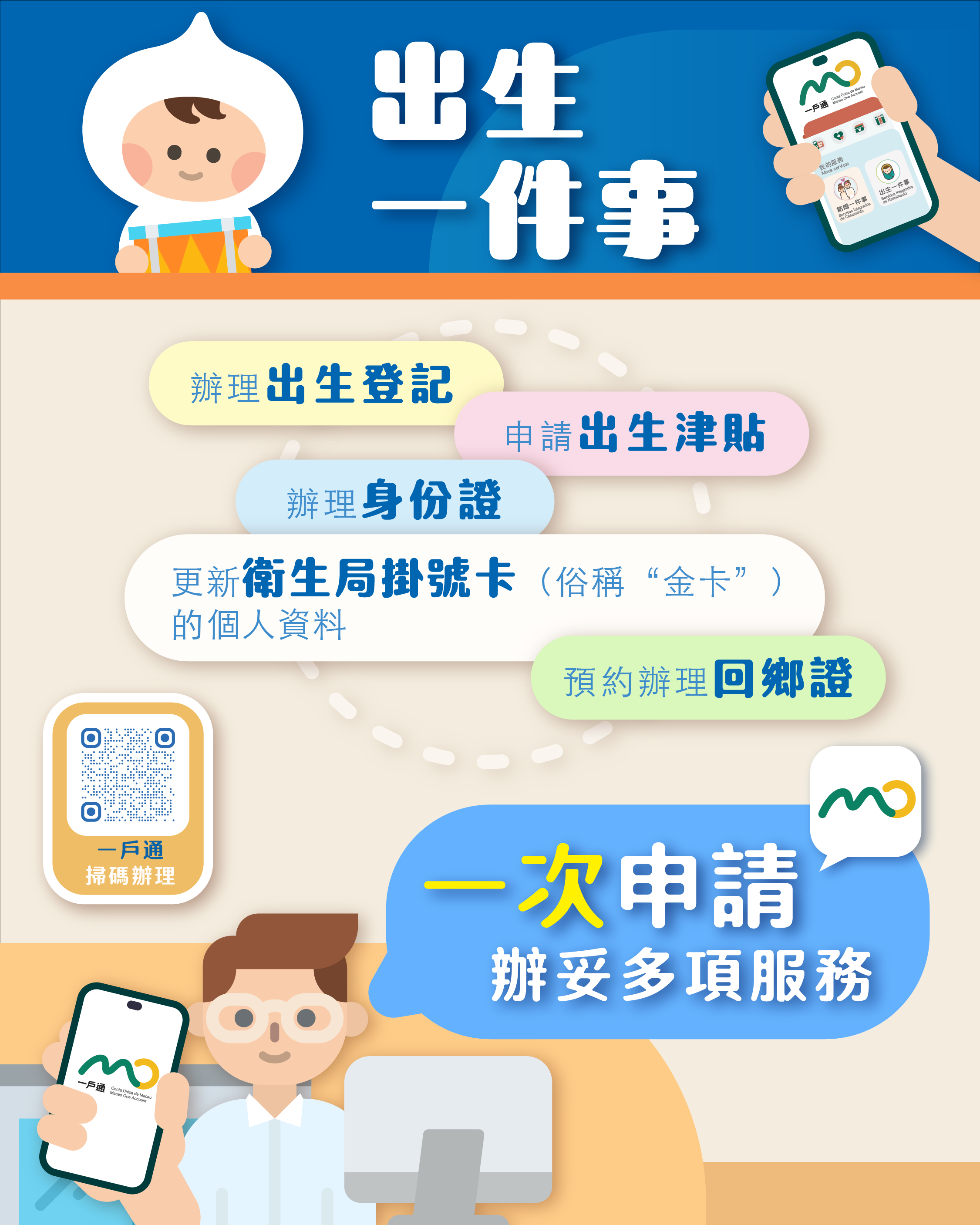 “出生一件事”則提供出生登記、辦理新生兒身份證、更新衛生局掛號卡個人資料、申請出生津貼以及預約辦理回鄉證的集成服務,讓合資格的新生兒父母一次辦妥與新生兒出生相關的多項服務,安心照顧新生兒,毋須再為辦理有關手續而奔波。