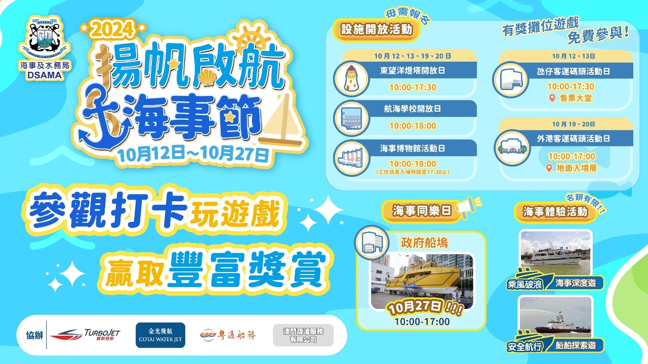 海事及水務局將於10月12至27日舉辦“揚帆啟航海事節2024”,透過海事設施開放、海事同樂日、出海體驗、參觀導賞船舶、攤位遊戲、工作坊等多元化活動,拉近海事與市民的距離,向大眾推廣本澳的海事專業工作和航海歷史文化,詳情可瀏覽海事及水務局網頁www.marine.gov.mo。