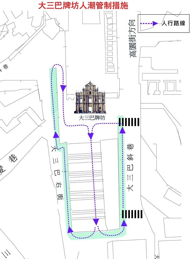 2.大三巴牌坊人潮管制措施,當大三巴牌坊範圍人群出現擠擁時,該區域會採取管制措施,市民或旅客可從牌坊腳兩邊小路上行抵達牌坊,而牌坊梯級只准下行(詳見附圖六)。