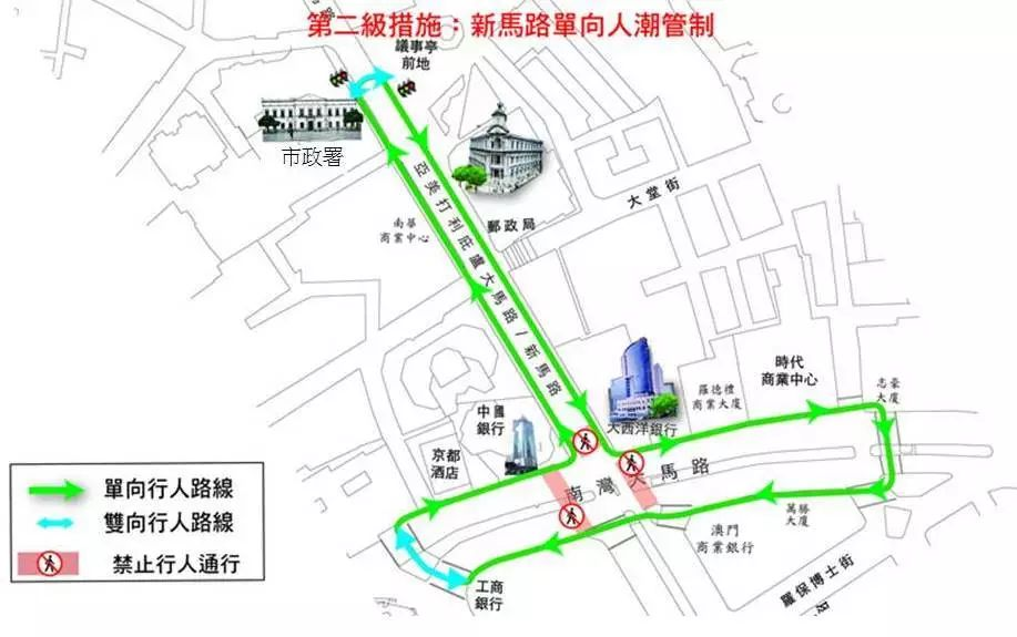 第二級措施:新馬路單向人潮管制。當第一級措施未能解決人群持續擠擁問題時,在第一級的基礎上,新馬路將實施單向人潮管制。行人需遵照附圖所示‘倒T’字型單向行進路線前往議事亭前地、大西洋銀行、匯豐銀行、商業銀行、工商銀行、中國銀行及市政署等地點(詳見附圖三)。