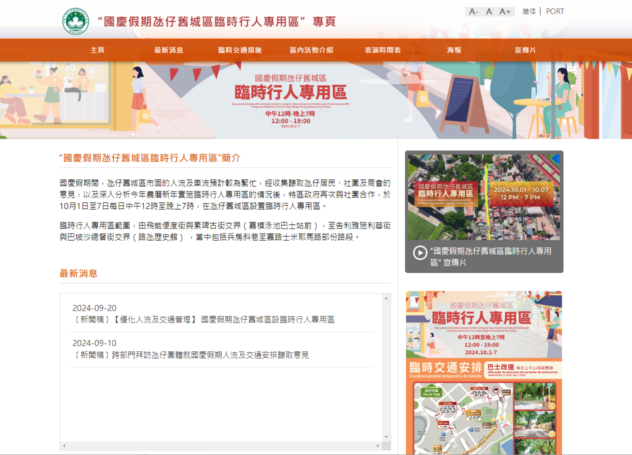 旅遊局的線上線下宣傳工作有序推進,已製作宣傳短片介紹臨時行人專用區措施及相關交通安排。此宣傳短片安排在多平台發佈,包括:旅遊局轄下各旅客詢問處;本地巴士電視;本地、香港、內地及海外的官方社交媒體等,讓訪澳旅客能夠提前了解有關安排。