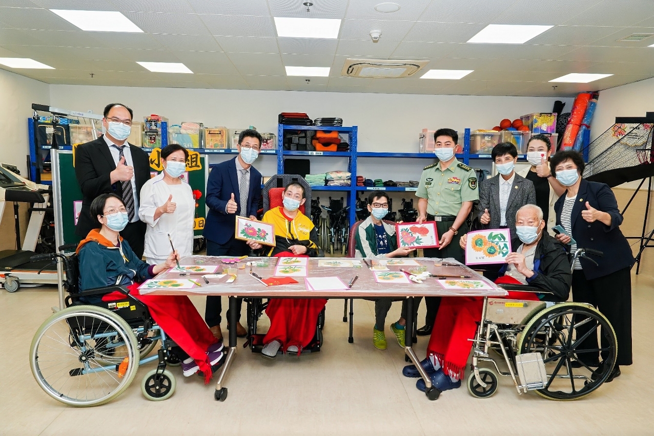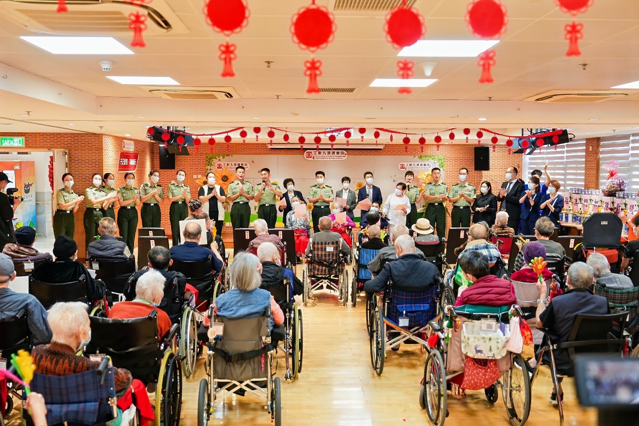 隨後,一行轉往功能室樓層,參觀了物理治療室及職業治療室。駐澳部隊官兵代表接著在綜合活動室與長者們互動,並為他們獻上精心準備的文藝節目。首先演出民族舞蹈《盛放》,讓長者們感受多彩民族的獨特文化魅力;接著演唱《三百六十五個祝福》一曲,寓意長者每天快樂平安;又表演樂器書法《我和我的祖國》,伴隨樂器演奏下書寫出一幅“福壽無疆”,向長者傳遞最真摯的祝福。最後,駐澳部隊官兵代表、社會工作局及工聯九澳護養院人員和長者一起合唱歌曲《紅日》,嘹亮的歌聲響遍全場,現場氣氛熱鬧、場面溫馨歡樂。中國人民解放軍自依法進駐澳門履行防務以來,時刻牢記神聖使命,認真履行防務職責,不斷加強與澳門社會的交流和溝通。駐澳部隊進駐澳門25年來,常態開展軍營開放、軍事夏令營等活動,廣大官兵積極參加澳門慰老愛幼、植樹獻血、愛心捐款等公益活動,與澳門同胞始終保持著血濃於水的深厚情誼。