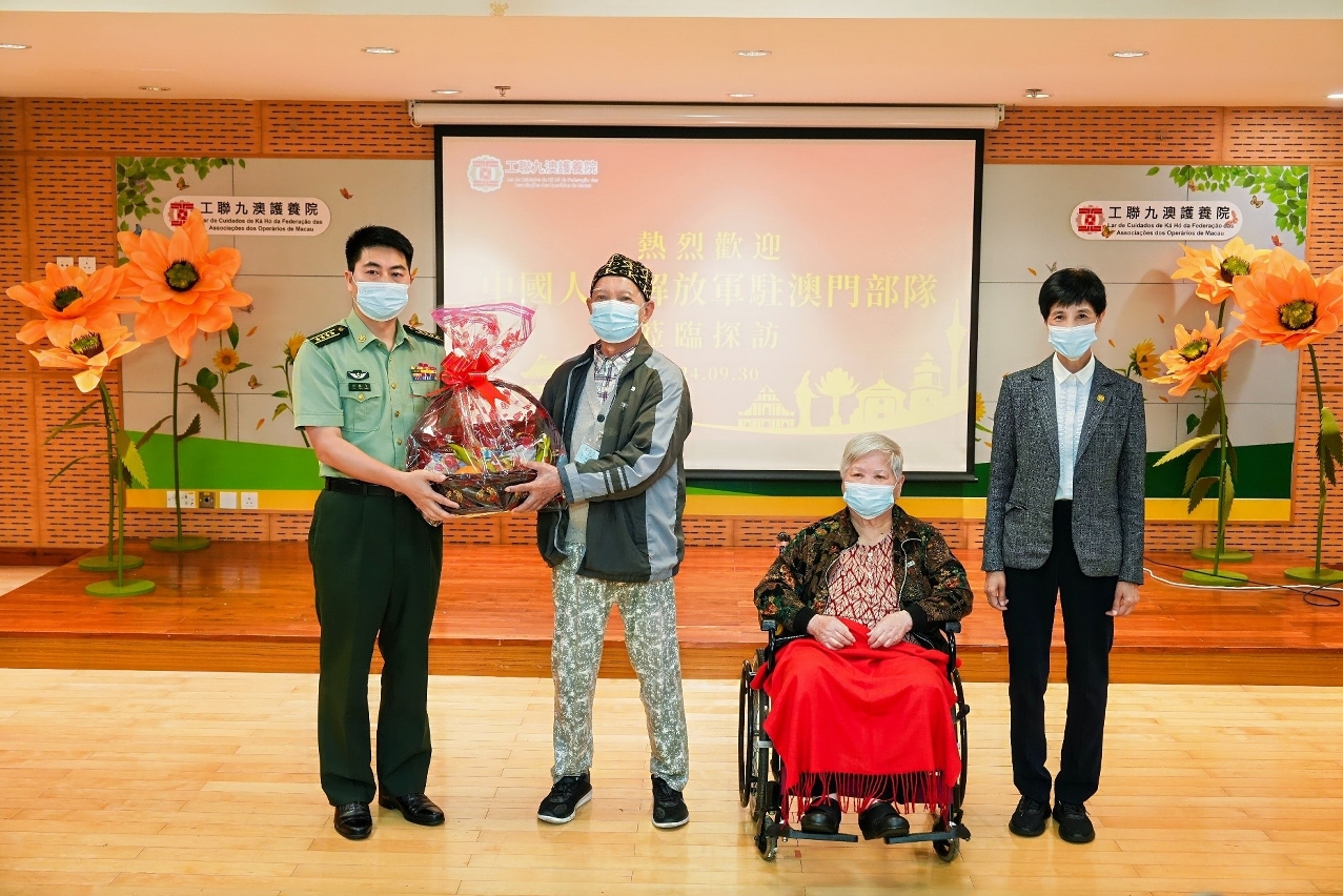 為感謝長者對本澳社會的貢獻,傳承敬老崇孝的社會價值,中國人民解放軍駐澳門部隊政治工作部劉陳長副主任與官兵代表,在澳門特別行政區政府社會工作局韓衛局長的陪同下,於9月30日下午到工聯九澳護養院慰問長者。