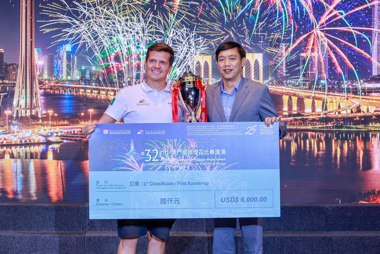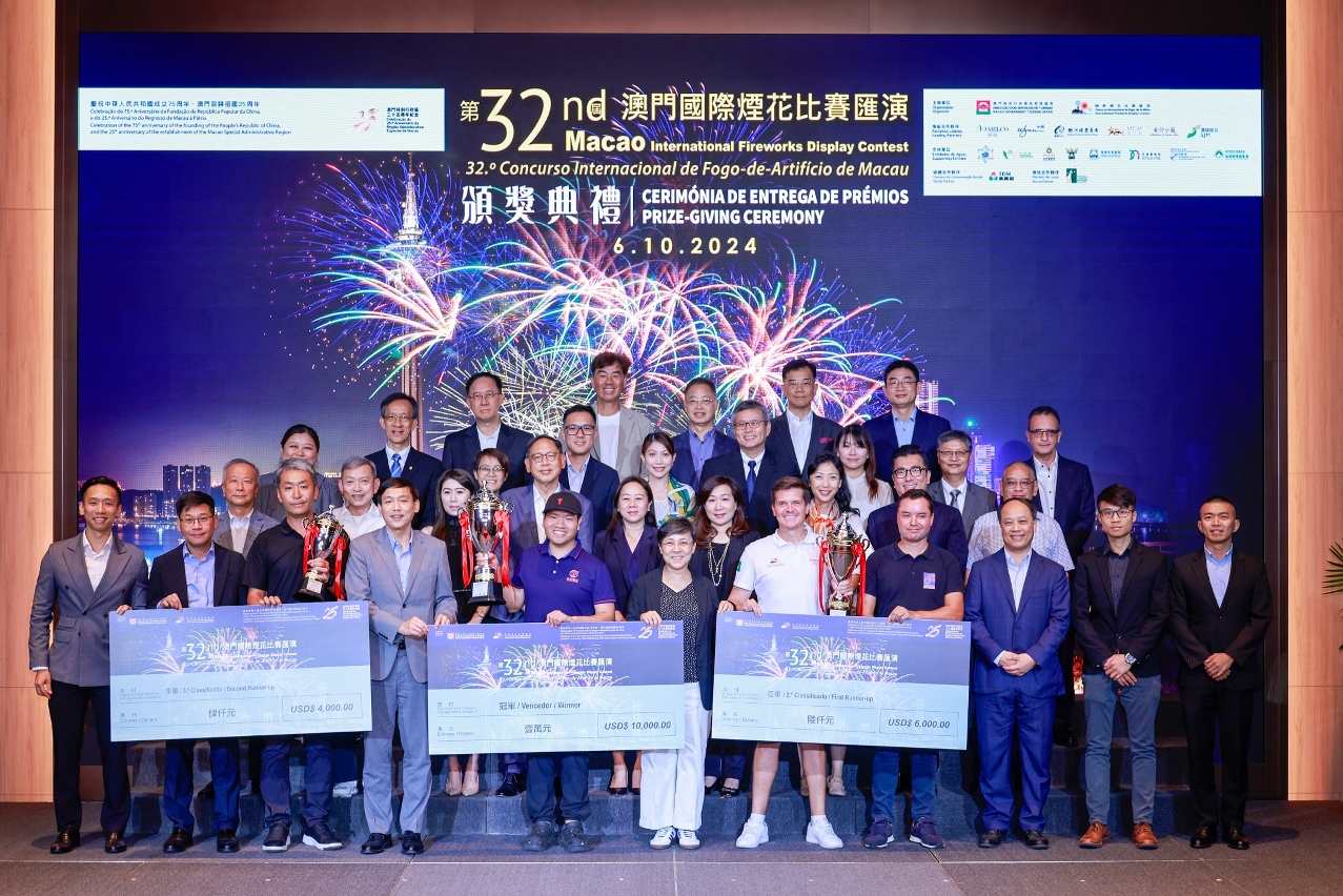 由旅遊局主辦的慶祝中華人民共和國成立75周年、澳門回歸祖國25周年第32屆澳門國際煙花比賽匯演於今(6日)晚上圓滿落幕並舉行頒獎典禮。來自世界各地的10間煙花公司施展渾身解數,在橫跨9月和10月的五個煙花夜爭妍綻放。經過一輪角逐,最終由來自中國內地的東信煙花公司奪得冠軍寶座,俄羅斯的Pyro-Klass煙花公司及日本的株式会社丸玉屋小勝煙火店分別奪得亞軍及季軍。
