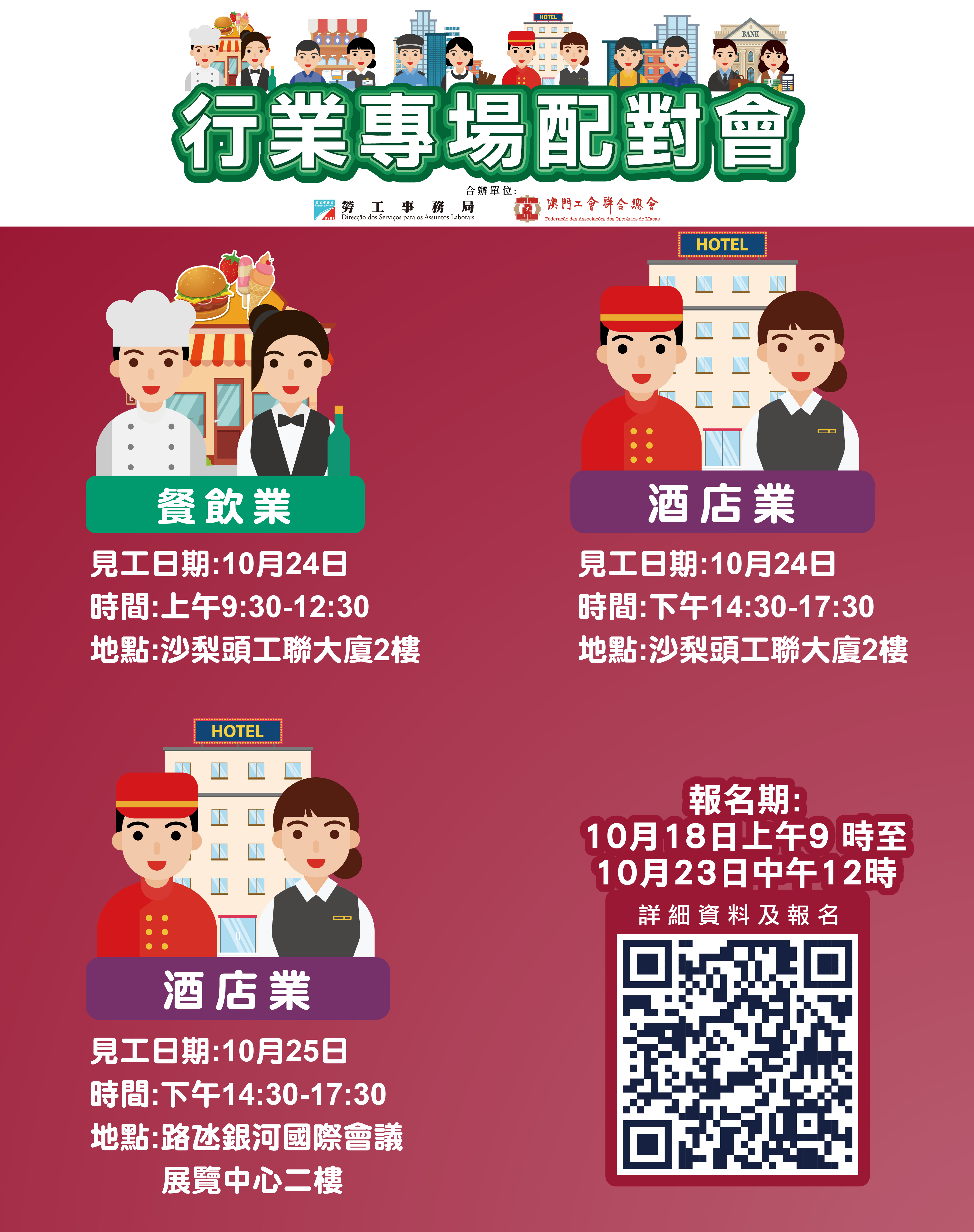 10月24日上午舉辦餐飲業配對會,提供59個職位空缺,涉及廚房主管、樓面部長、廚師、廚師助理及餐飲服務員等。下午舉辦酒店業配對會,提供41個職位空缺,涉及餐廳及酒吧經理、前堂主任、餐飲部部長、廚師(中餐/西餐/點心)、接待員、餐廳服務員及工程部技術員等。以上兩場配對會在澳門工會聯合總會二樓(沙梨頭海邊街2-6號工聯大廈)舉行。