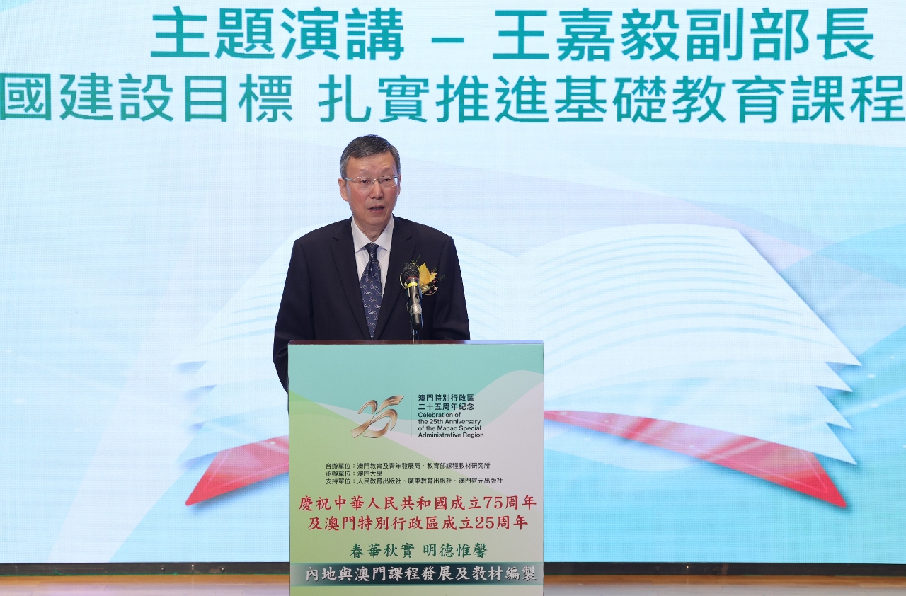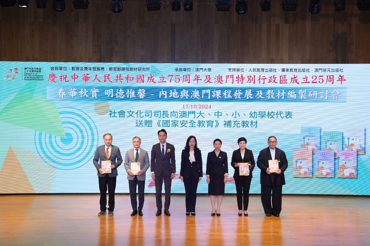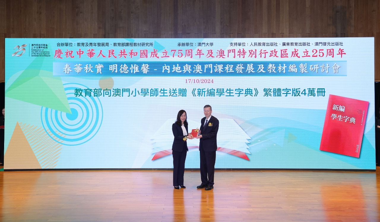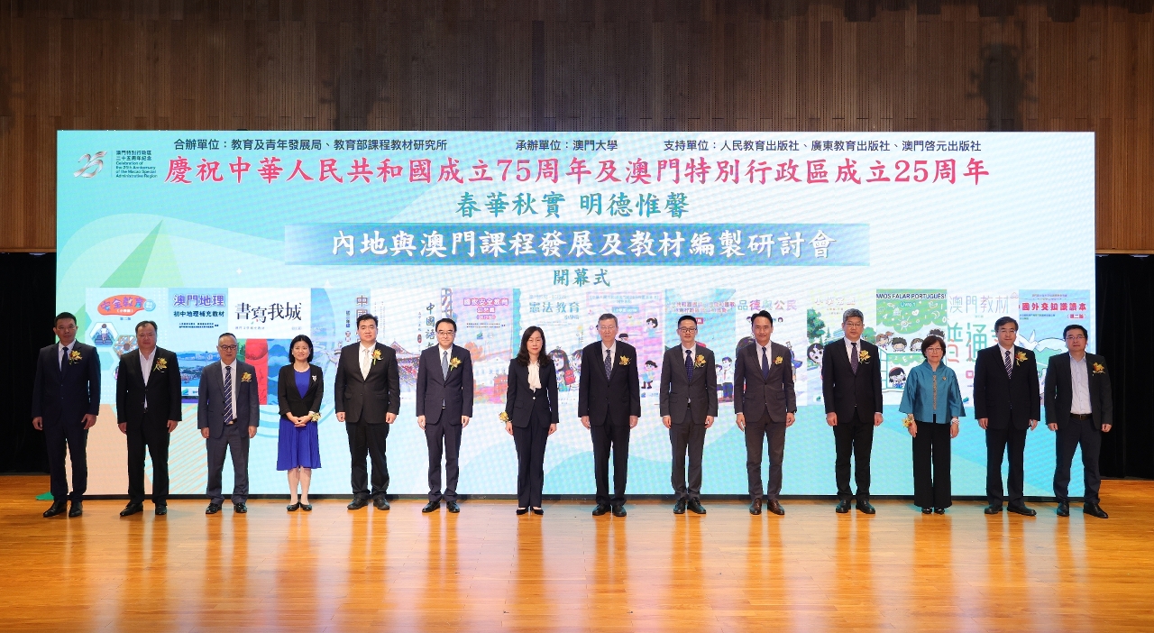 適逢本年為中華人民共和國成立75周年和澳門特別行政區成立25周年,為展示“一國兩制”在澳門成功實踐的重大意義,由教育及青年發展局與國家教育部課程教材研究所合辦,澳門大學承辦,人民教育出版社、廣東教育出版社及澳門啓元出版社支持的“內地與澳門課程發展及教材編製研討會”於10月17日在澳門大學學生活動中心舉行。研討會邀請內地及本澳課程教材領域的專家學者,與澳門教育界共同探討課程改革及合作出版教材的成功經驗,同場設有“內地與澳門大中小學教材展”,展示和回顧兩地教材發展的歷史和成果。