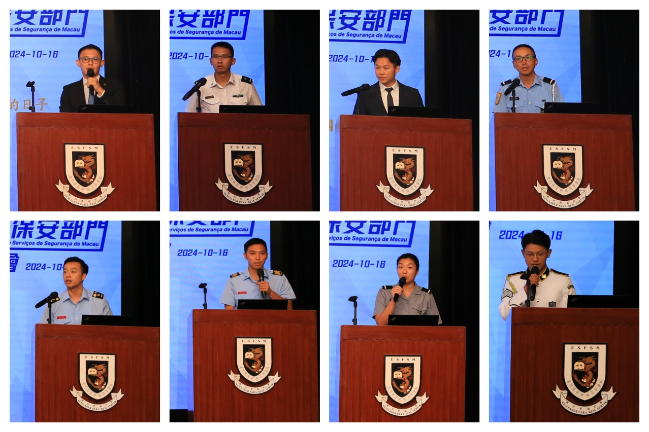 本年分享會共有八位人員作出分享,分別任職於保安部隊及保安部門不同的工作崗位,題目依次為:警察總局首席刑事偵查員崔家強的“行與思─我在大型聯合演練的日子”、澳門海關關務督察林志文的《嚴防走水“守關”門》、司法警察局職務主管周錠軒的“派駐國際刑警組織─勇於挑戰·專業執法·邁向國際”、治安警察局副警長鄭偉強的“遇風,馭風,破風”、澳門保安部隊高等學校副一等消防區長譚健明的“教有所得 學有所成” 、消防局首席消防員黃崇昇的“命懸一線”、懲教管理局副警長凌惠婷的“‘懲’心話”,以及治安警察局首席警員何志斌的“音符下的責任”。每一位分享者以親身經歷訴說他們的警察故事,在崗位上如何發揮專業,秉持保安當局提出的三個警務理念:“主動警務”、“社區警務”和“公關警務”。