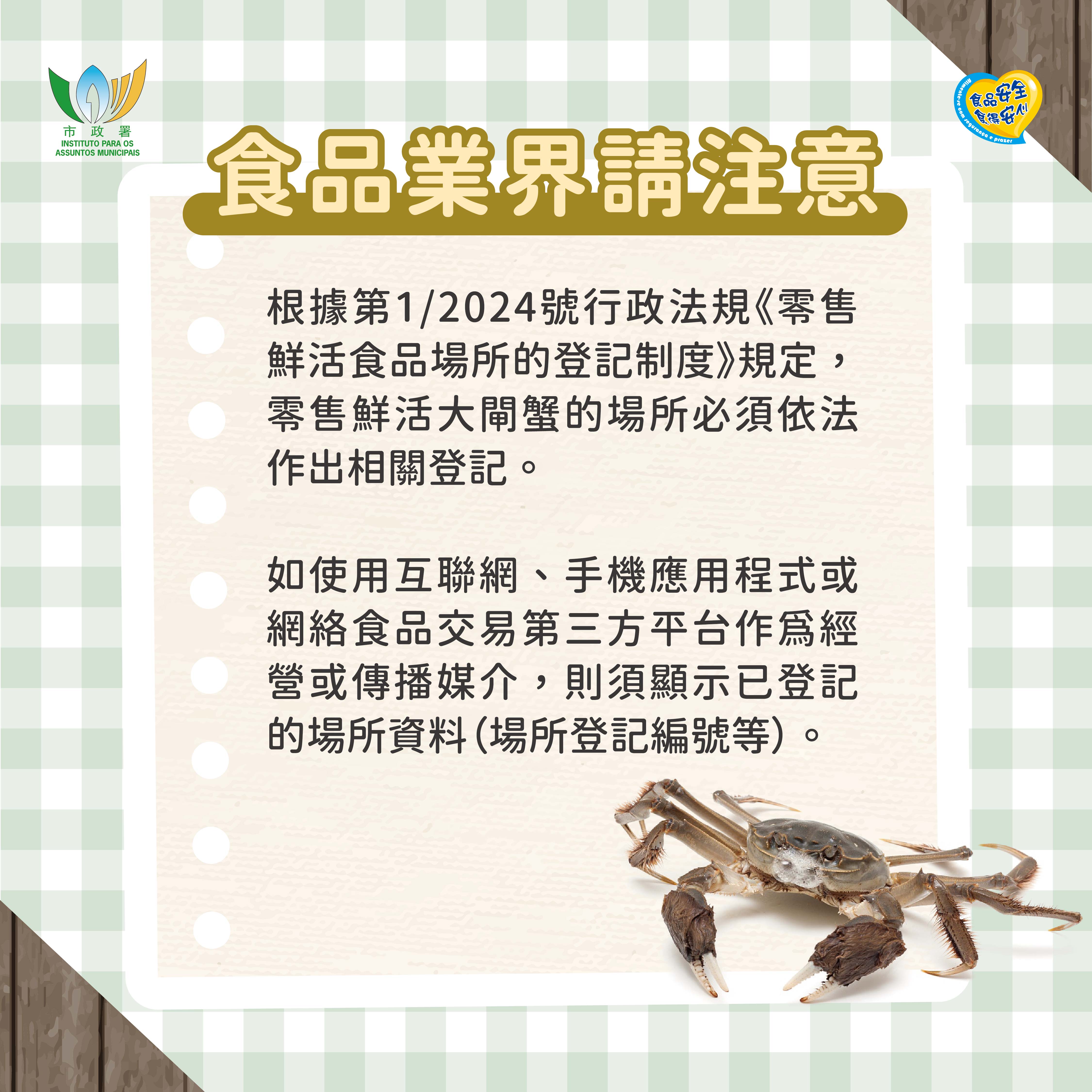 進入大閘蟹消費旺季,市政署持續透過嚴格的入口檢驗檢疫制度及市場巡查機制,從入口到供應零售層面加強對大閘蟹的監管,以保障其品質及食用安全。市政署提醒本澳食品業界,不論以任何形式銷售大閘蟹,均須確保經正途入口及已完成檢驗檢疫,切勿供應及出售未經檢疫之大閘蟹,否則可被檢控。同時,根據“零售鮮活食品場所的登記制度”,所有零售鮮活食品的場所都必須依法登記;如使用互聯網、社交平台或第三方交易平台等作為經營或宣傳媒介,亦須於該平台上顯示場所登記編號等資料,以供消費者識別。
