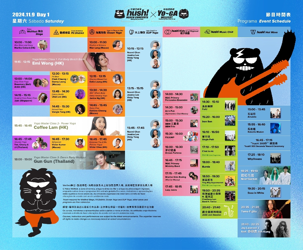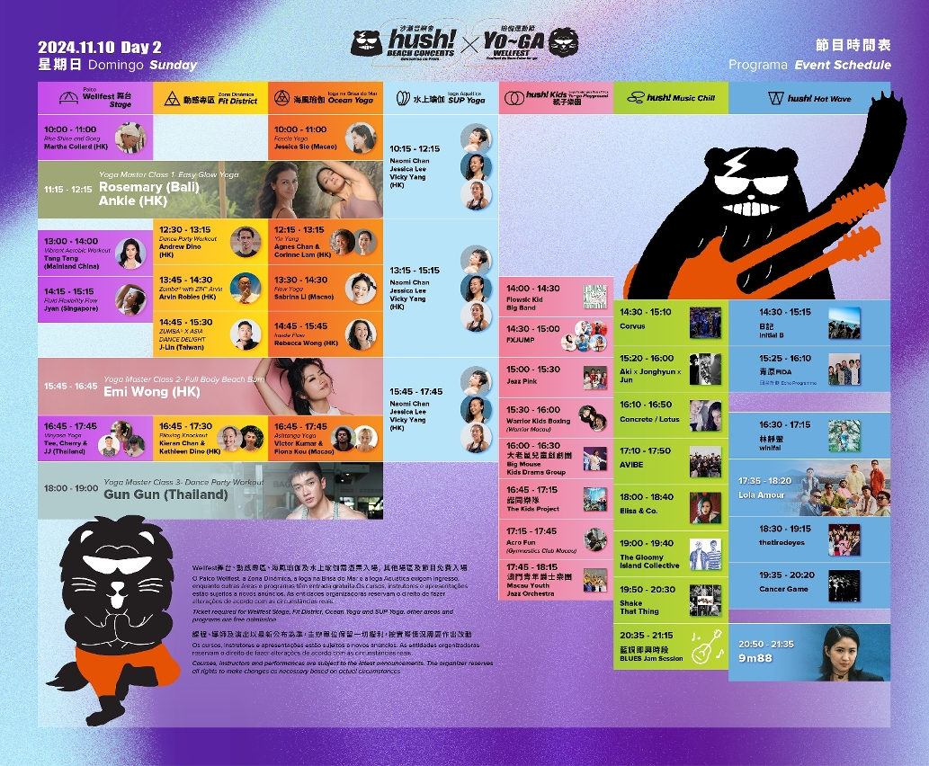 由文化局與美高梅合辦,市政署、海事及水務局、旅遊局協辦的“hush! 沙灘音樂會 x Yo~ga 瑜伽運動節2024”,主活動將於11月9日至10日(周六、日)在黑沙海灘舉行,30多位亞洲星級健身及瑜伽導師,近60隊海內外樂隊、音樂人及藝術工作者,將一連兩日輪番帶來精彩的瑜伽運動課程及音樂表演,打造沿海岸線的馬拉松式音樂瑜伽盛會。