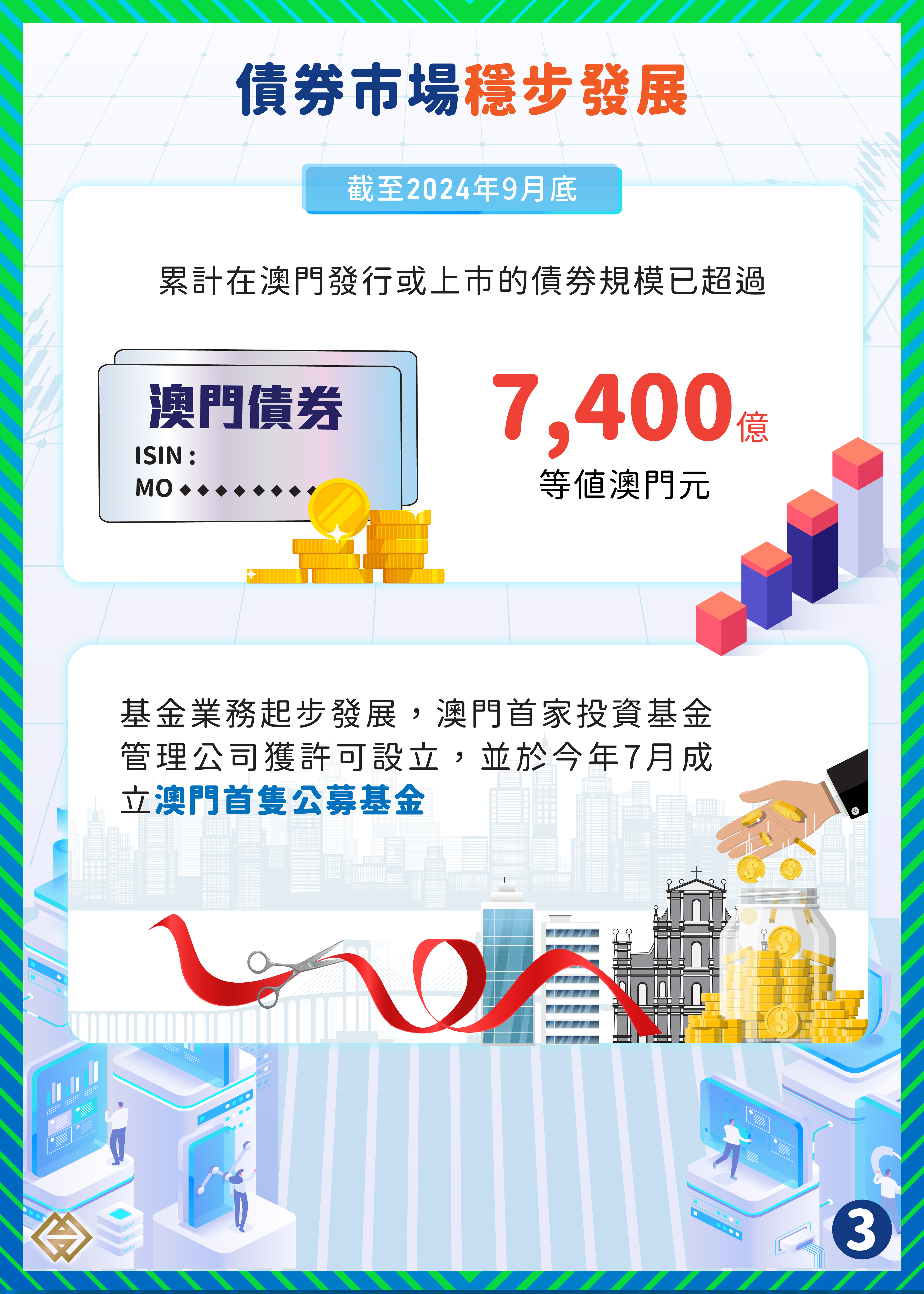 債券市場穩步發展,截至今年9月,累計在澳門發行或上市的債券規模已超過7,400億等值澳門元。基金業務起步發展,澳門首家投資基金管理公司獲許可設立,並於今年7月成立澳門首隻公募基金。