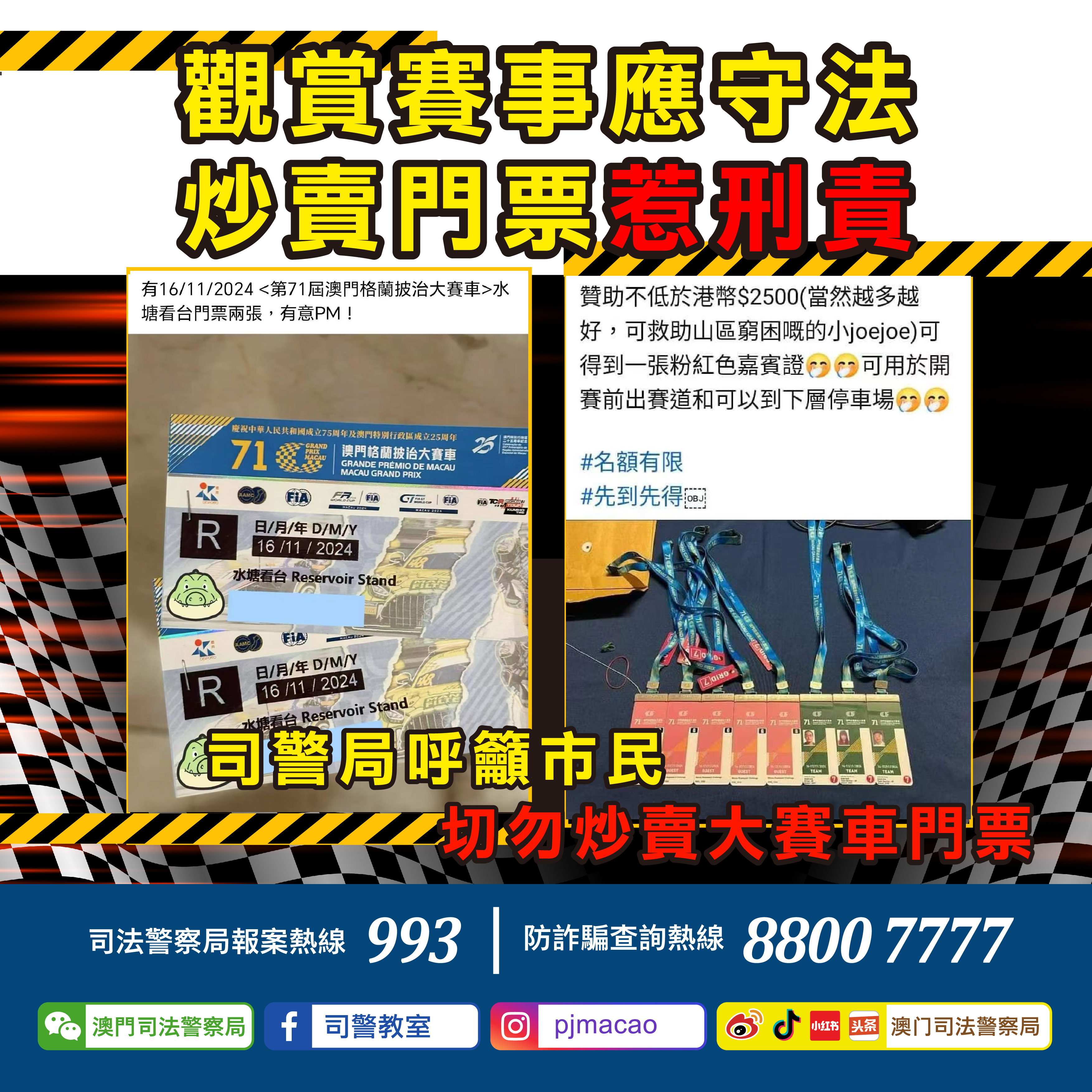警情通告:觀賞賽事應守法 炒賣門票惹刑責 司警局再次呼籲市民切勿炒賣大賽車門票