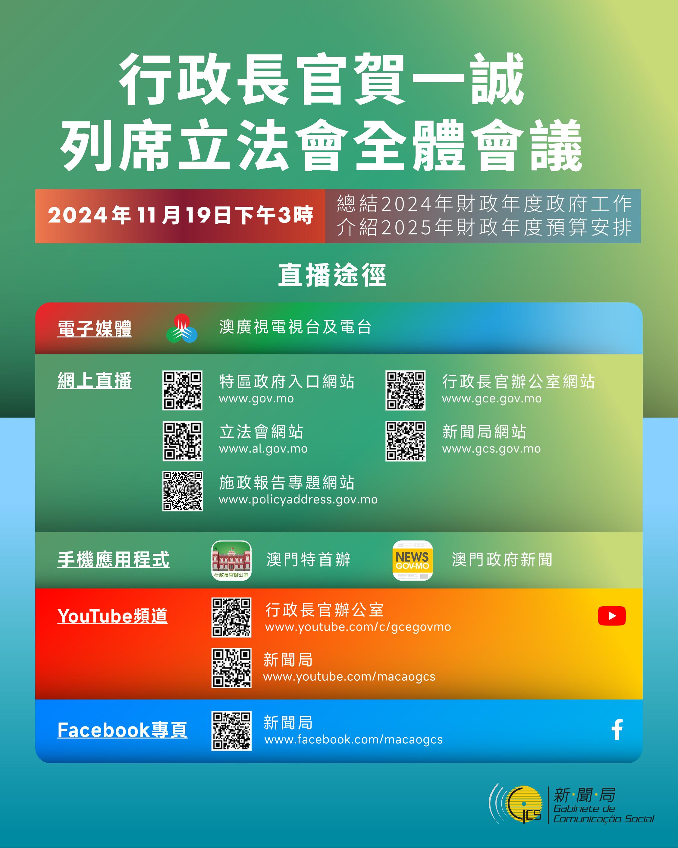 行政長官賀一誠將於明(19)日下午3時列席立法會全體會議,總結2024年財政年度政府工作,以及介紹2025年財政年度預算安排。其後於下午5時15分在政府總部舉行記者會回應傳媒提問。
