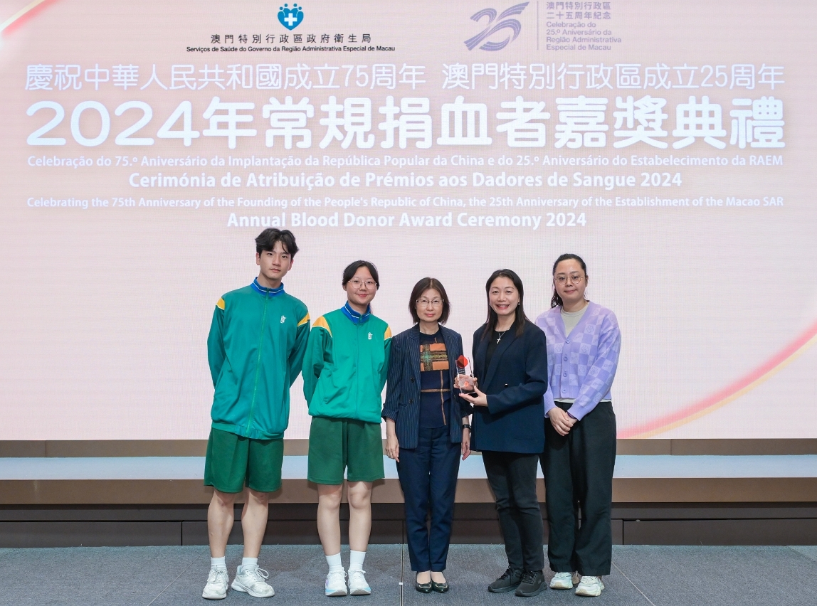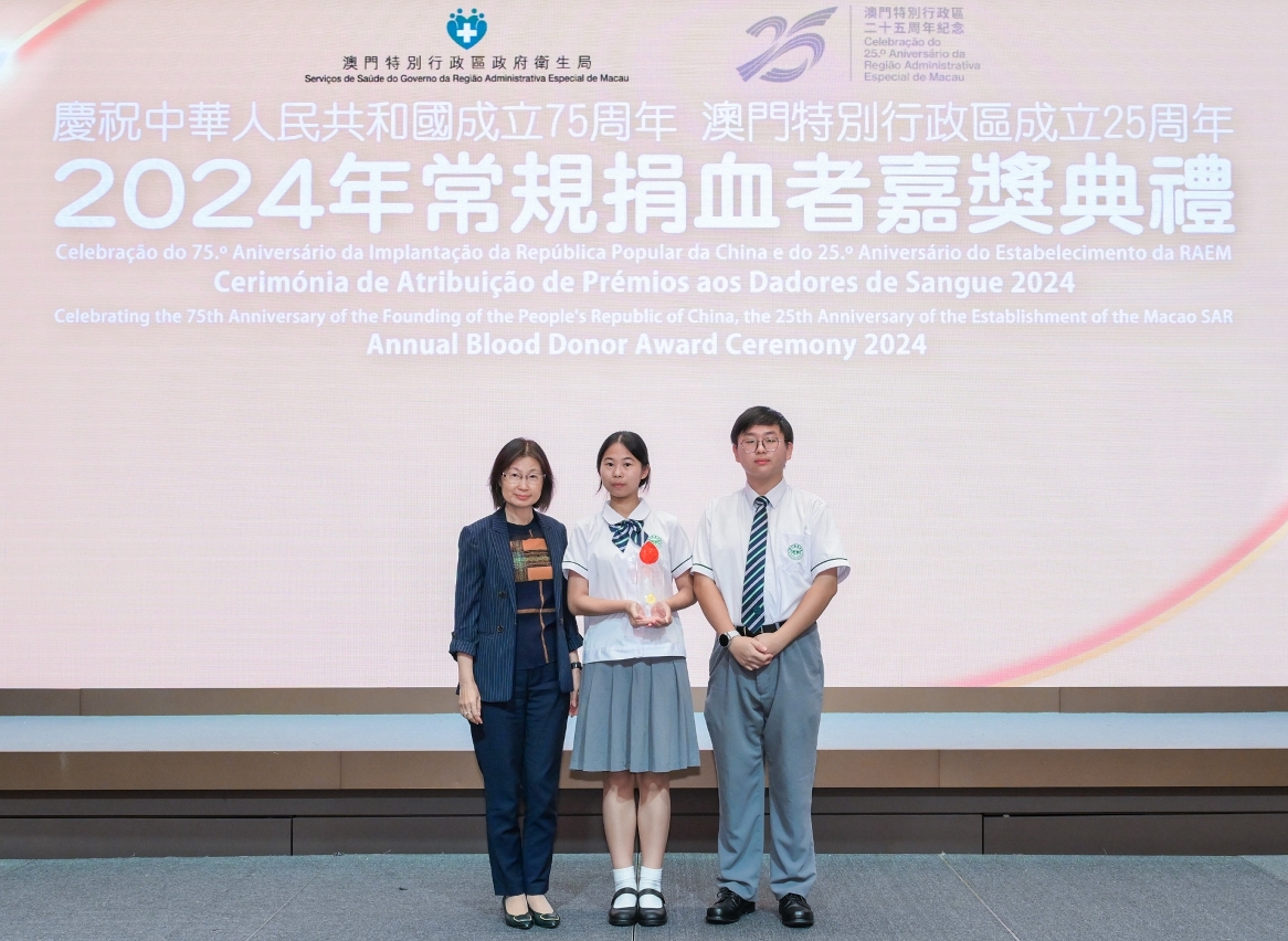 慶祝中華人民共和國成立75周年、澳門特別行政區成立25周年-2024年常規捐血者嘉奬典禮於日前圓滿舉行。衛生局羅奕龍局長、中國人民解放軍駐澳門部隊保障部張春棟部長、中央人民政府駐澳門特別行政區聯絡辦公室宣傳文化部綜合處王惠杰處長等出席了典禮,並向獲獎的部門、團體、機構、學校和個人等頒發奬項,以公開表揚無私奉獻的捐血者和協助推動捐血的社團和機構,以引起社會共同關注本澳血液需求,鼓勵更多居民積極參與捐血活動。