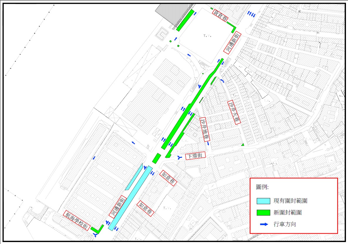 配合內港南雨水泵站及下水道第二期的中央分隔帶恢復工程,自2024年11月23日起實施以下臨時交通措施,有關工程已進入竣工階段,河邊新街大部分行車道已完成及重新開放雙向四線行車道,目前餘下工作為中央分隔帶恢復及行人路重鋪工作: