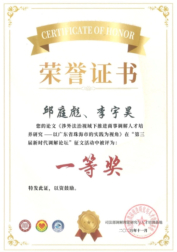 由澳門大學法學院副院長兼博士生導師邱庭彪與該院博士生李宇昊共同撰寫的論文,為涉外法治視域下培養商事調解人才提供了有益的思路和啟示,於第三屆新時代調解論壇徵文中榮獲一等獎,是澳門地區唯一的一等獎論文。