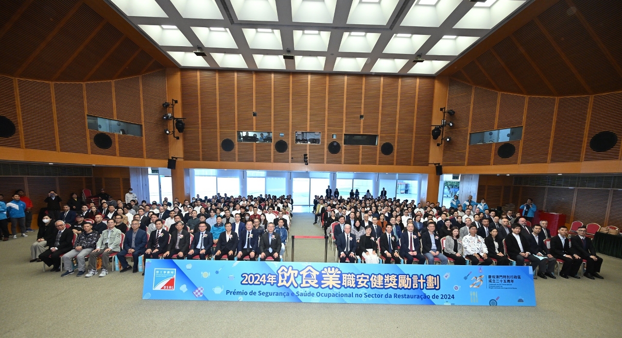 由勞工事務局主辦的「2024年飲食業職安健獎勵計劃」,分享會暨頒獎典禮於11月27日下午假澳門科學館會議廳舉行。今屆參賽餐廳和人員數目是歷屆最多,共有71間餐廳和145名安全管理人員和工友參賽,反應踴躍。
