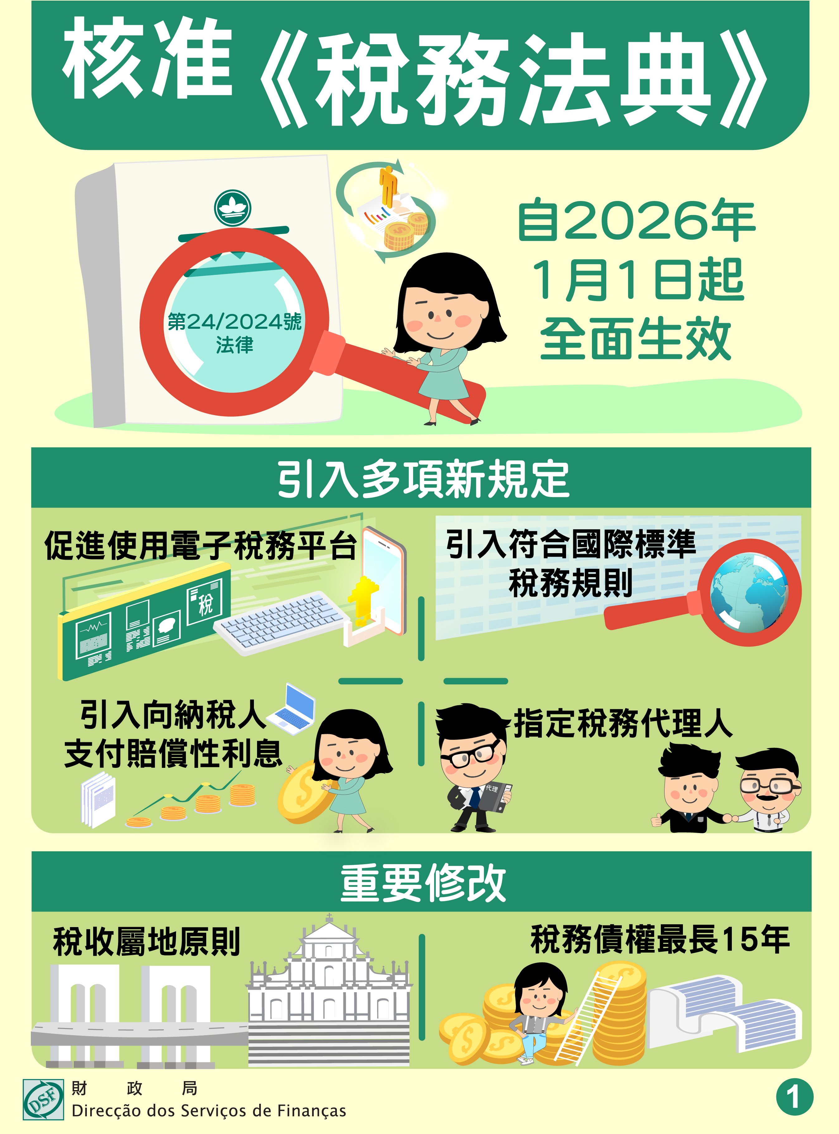 核准《稅務法典》自2026年1月1日起全面生效。相關過渡規定,包括統一納稅人的稅務住所,自2026年1月1日起計一年內,納稅人應向財政局告知或變更其獨一稅務住所。
