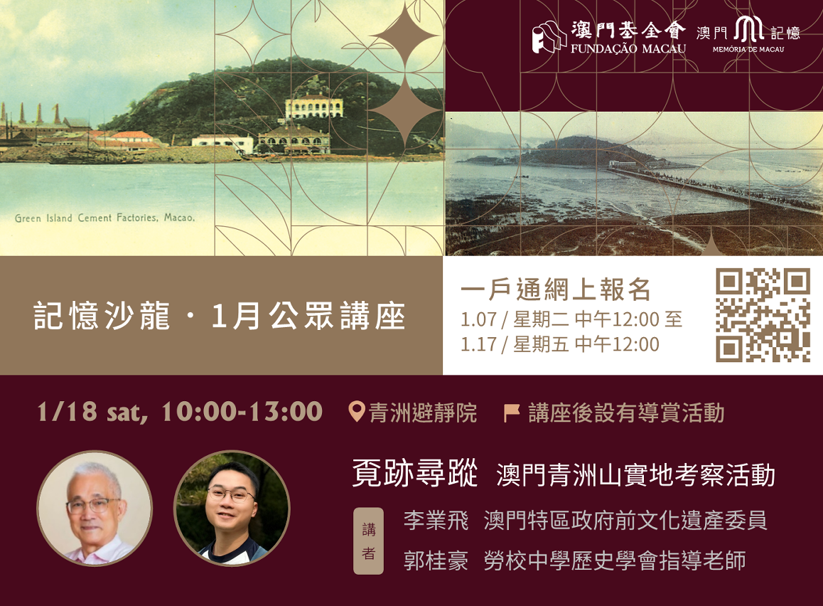 澳門基金會開展的“澳門記憶”文史網今年首場“記憶沙龍”公眾講座,將與參加者一同探尋青洲山豐富歷史內涵,活動將於1月7日中午12時開始接受報名。