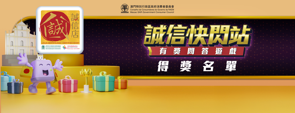“誠信快閃站”有獎問答遊戲50位得獎者名單已公佈於消委會網頁(https://www.consumer.gov.mo)及消委會辦事處公佈欄內,以供查閱,得獎者將收到消委會發出的短訊通知,並可於即日起至2 月 7 日攜同參加遊戲登記抽獎時相同之有效澳門居民身份證,親臨澳門高士德大馬路26號何鴻燊夫人大廈 4 樓領獎,代領者須攜同得獎者之證件副本、代領者之身份證明文件正本,以及經得獎者簽署之授權書正本辦理領獎手續,如有查詢,可致電89887365。