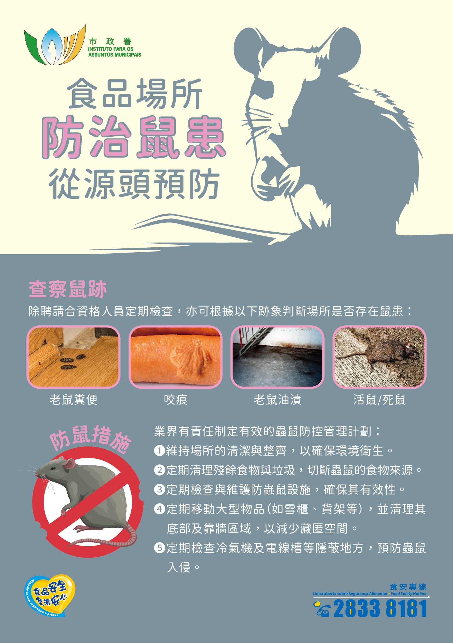 市政署持續與食品業界保持協作,提供各類食安教育及衛生指引,督促業界在日常營運中做好鼠患防治工作,定期檢查場所設備及各項工序,切實執行食安及環衛管理。業界亦可派員參加市政署定期舉辦的“食品衛生督導課程”及“食品安全與環境衛生基礎班”,學習有效預防和控制鼠患的方法。2024年相關課程共舉辦三十班,約八百名食品從業人員接受培訓。