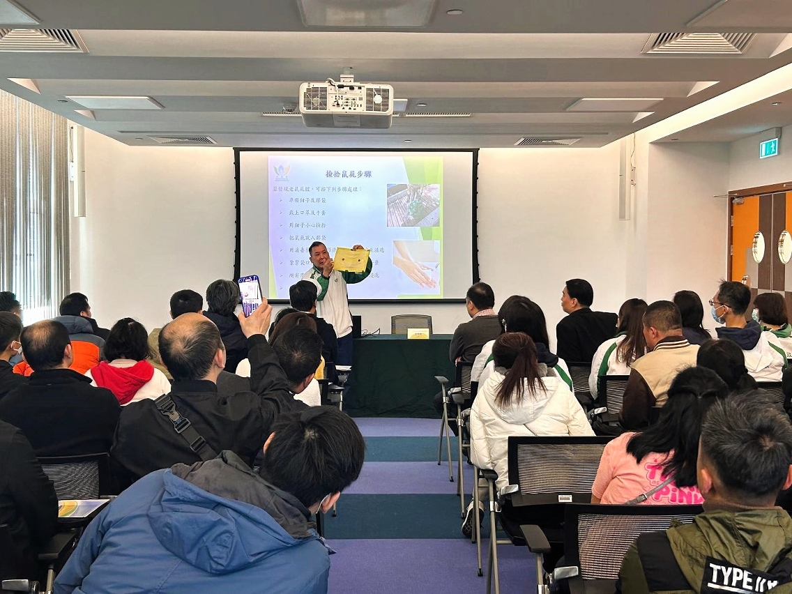 市政署代表向與會者分享了如何透過鼠跡,判斷場所是否存在鼠患;並重點講解有效的防鼠策略,包括加強環境衛生、清除老鼠藏身地點、堵塞老鼠通路、妥善處理食物及垃圾等,營造“冇埞匿”、“冇路走”、“冇嘢食”的 “防鼠三冇”環境,幫助業界從源頭做起,預防鼠患的發生。同場設交流環節,與會者就如何因應場所特性,採取有效的防鼠措施,以及防鼠設施設備的更新及維護等踴躍發問。