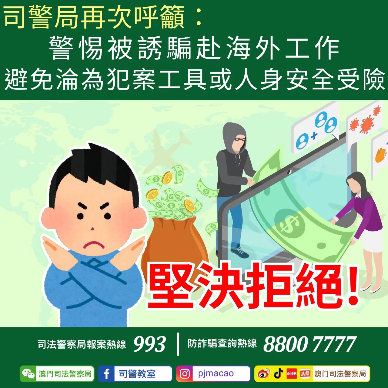 由上述事例可見,以及鑑於近日發生中國公民受騙到境外工作後遭誘拐至第三國被迫從事犯罪活動的事件,為免本澳居民受害,司法警察局現再度發出警情通告,強烈呼籲公眾加強警惕境外工作騙局,如有親友提及將赴外工作,應主動關心提醒。