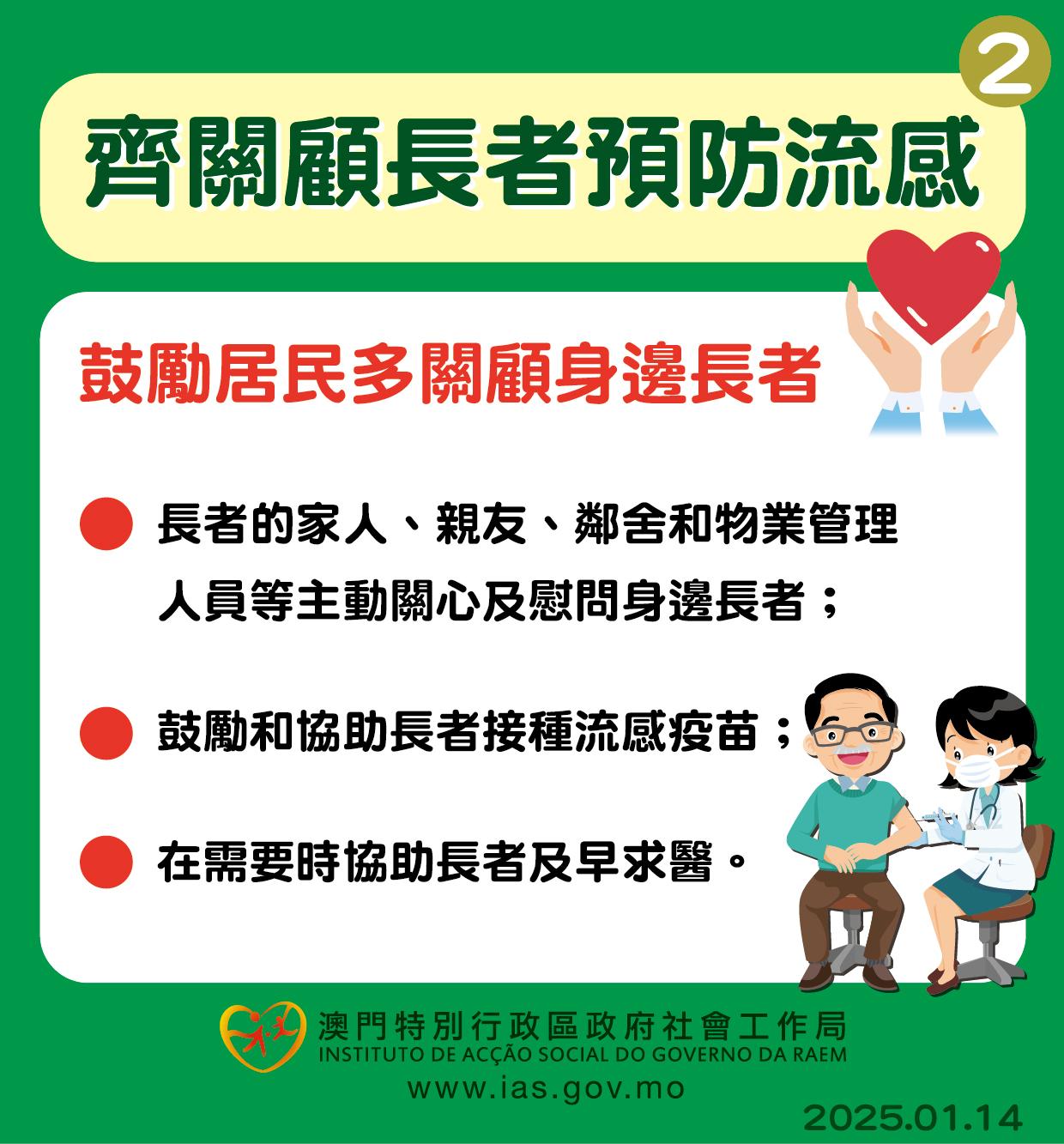 此外,社會工作局呼籲長者,尤其屬獨居或兩老家庭的長者留意天氣變化,保重身體,注意保暖,在人多擠迫的地方應佩戴口罩。倘有不適,應及早求醫,並在需要時向家人、親友及/或社會服務設施等尋求協助。社會工作局同時呼籲長者的家人、親友、鄰舍和物業管理人員等主動關心及慰問身邊長者。