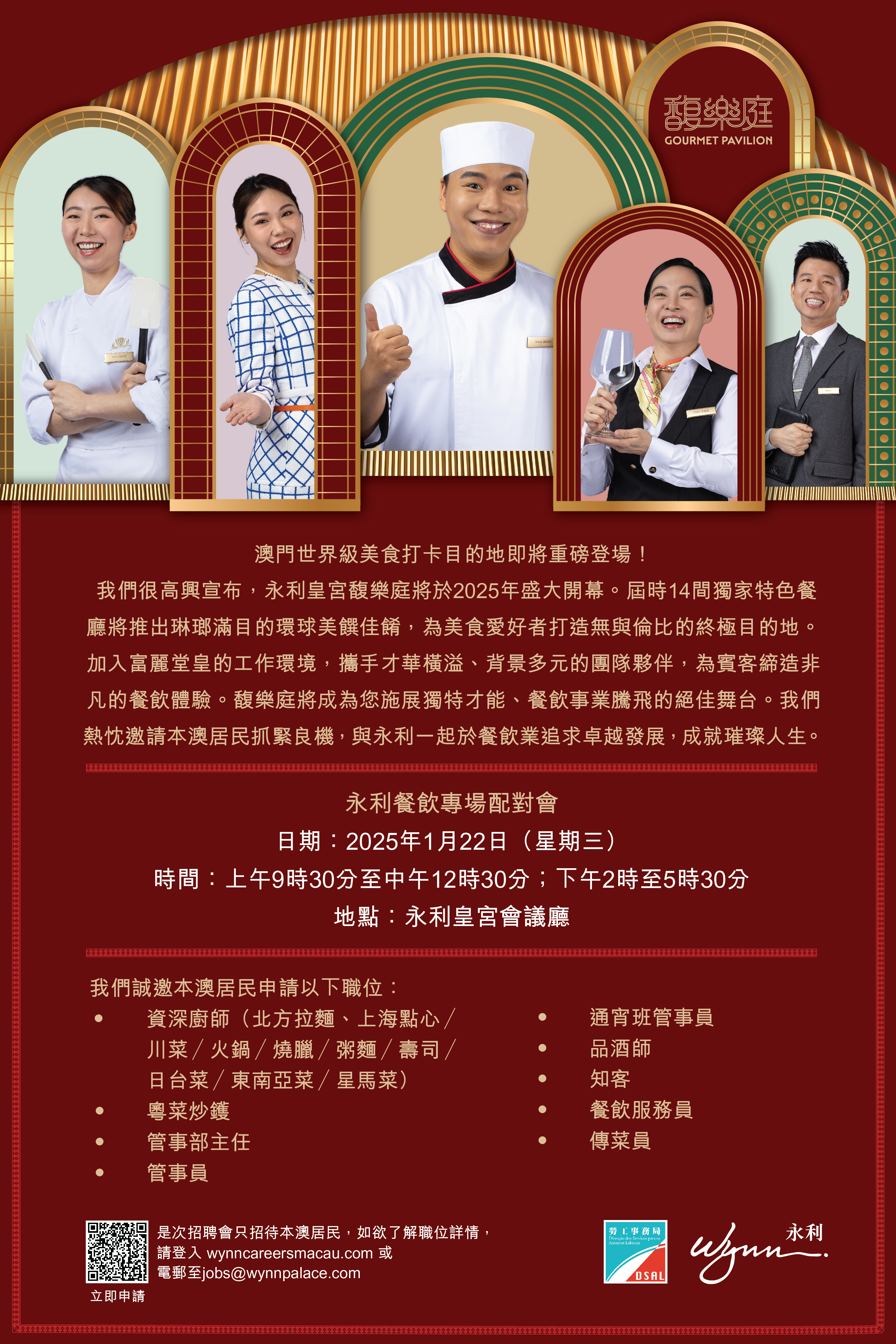 為協助澳門居民就業,並配合推動澳門“美食之都”發展的工作,勞工事務局和永利澳門有限公司(下稱“永利澳門”)合作於月1月22日舉辦餐飲專場配對會,藉此招聘有意投身餐飲事業的澳門居民。報名日期為1月15日上午9時至1月21日中午12時。