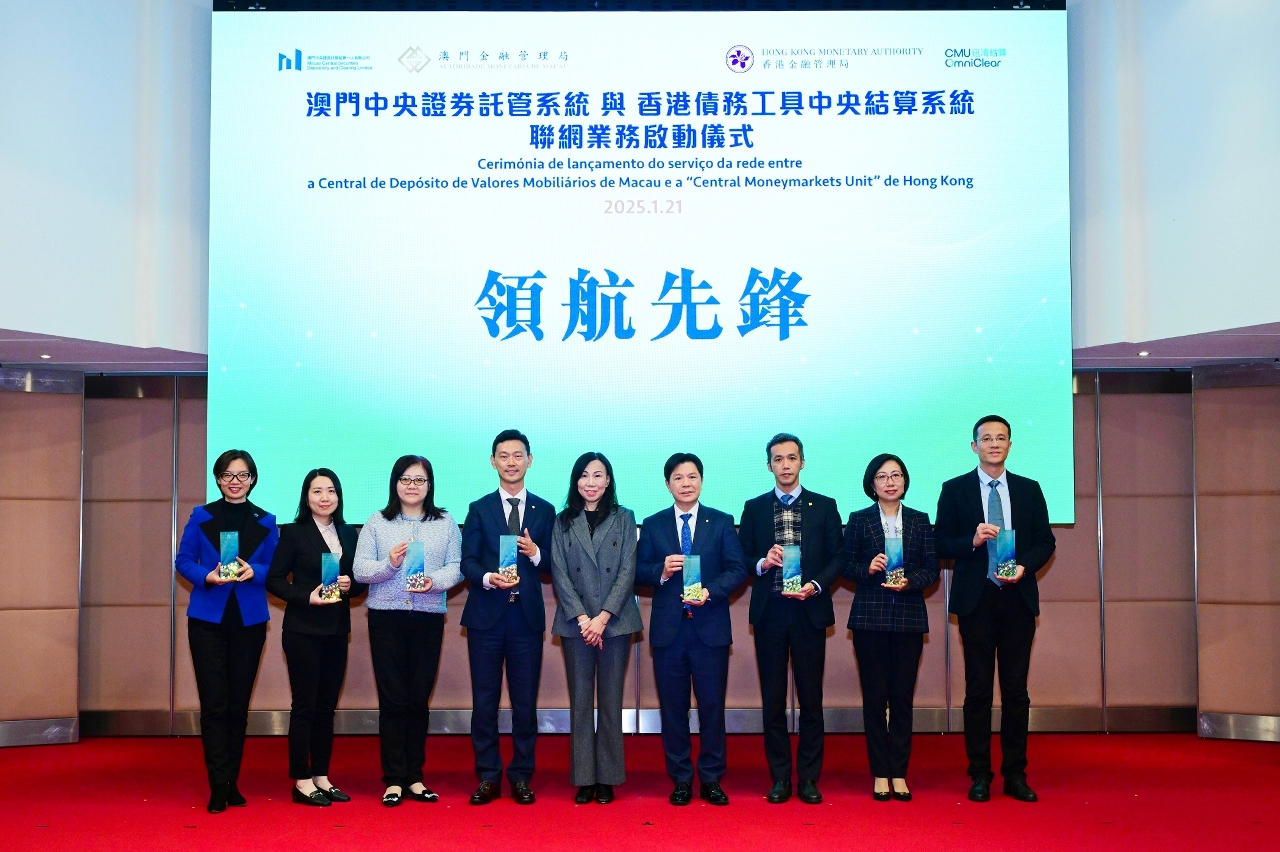 在澳門金融管理局(澳門金管局)和香港金融管理局(香港金管局)的支持下,澳門中央證券託管結算一人有限公司(MCSD)與迅清結算有限公司(迅清結算)共同主辦的“澳門中央證券託管系統(CSD)與香港債務工具中央結算系統(CMU)聯網業務啟動儀式”於今(21)日圓滿舉行。