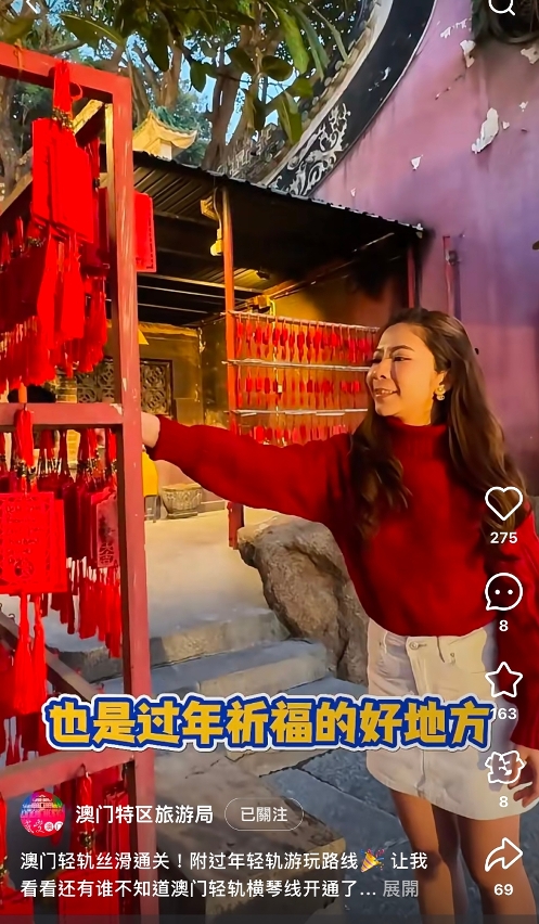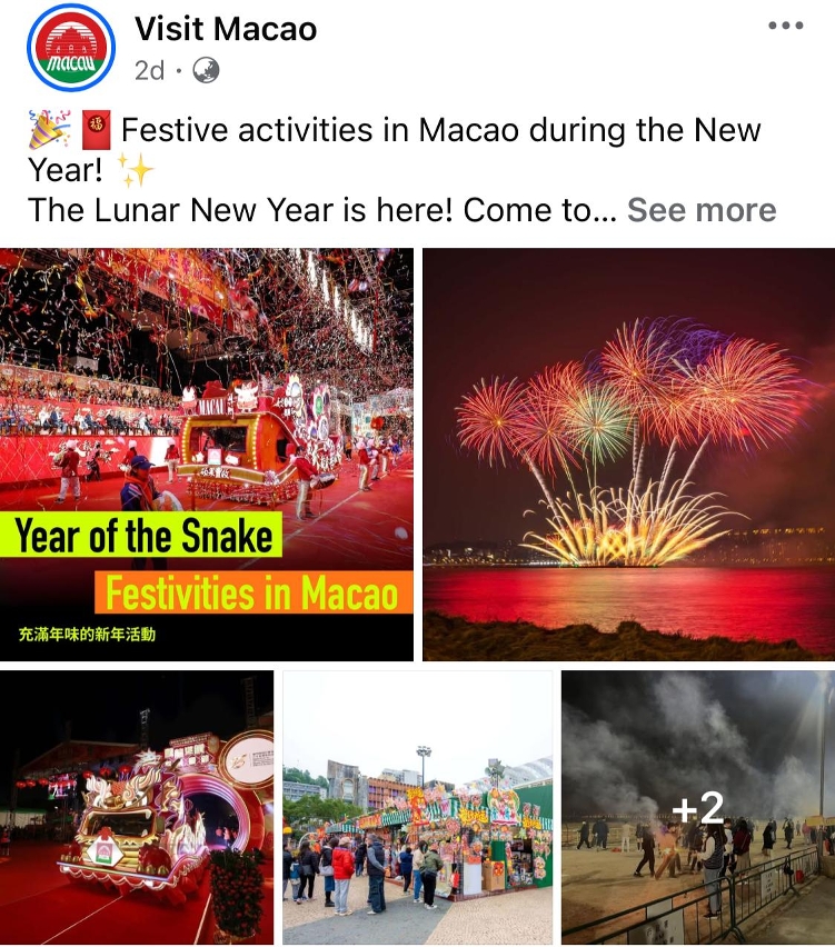 旅遊局積極鋪開線上線下宣傳工作,向旅客推廣澳門旅遊及農曆新年節慶活動,包括在社交平台發帖宣傳及邀請旅遊網絡達人在其頻道直播及宣傳,以及投放電視廣告、巴士廣告和戶外廣告等,又繼續在旅遊局月刊《旅遊快訊》宣傳澳門當月盛事活動。