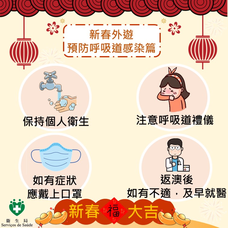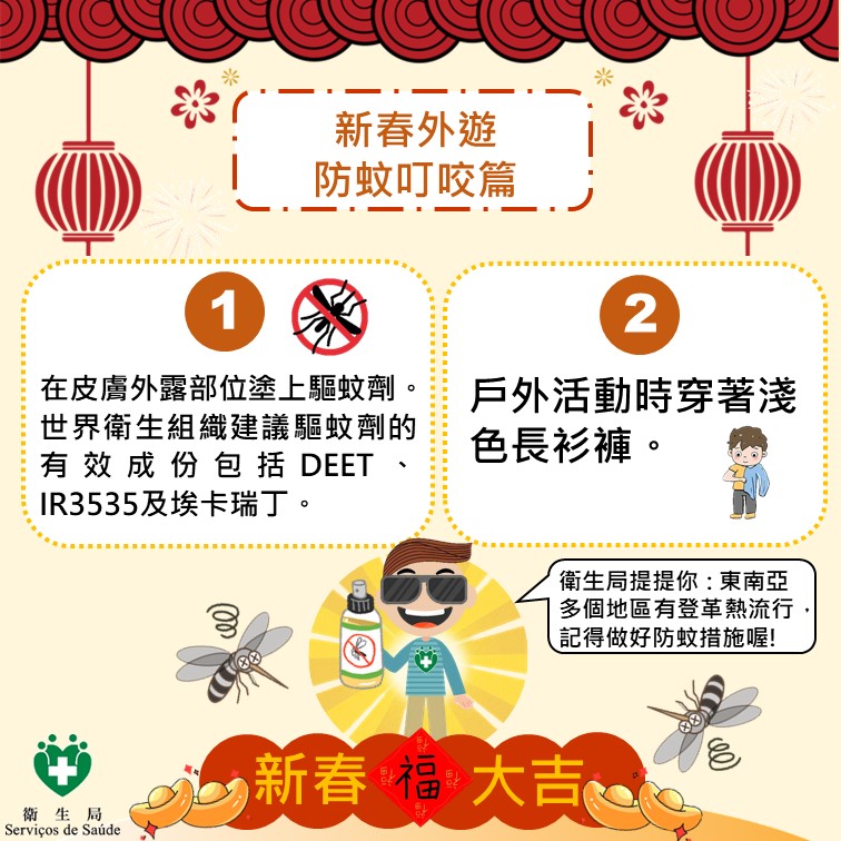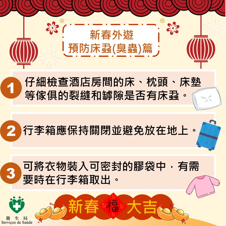 隨着春節假期臨近,不少居民會外遊或探親,為確保健康與安全,衛生局特別提醒居民在外遊期間,應加強個人、食物及環境衛生,注意防範床蝨叮咬,並預防感染登革熱、呼吸道傳染病、胃腸道疾病等,採取足夠有效的預防措施以降低感染疾病的風險。