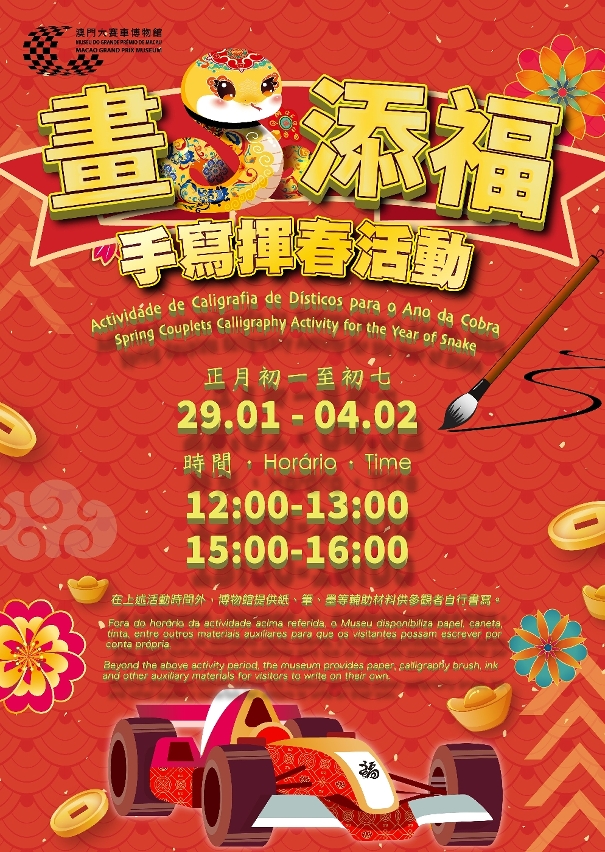 旅遊局轄下的澳門大賽車博物館在新春期間包括2月4日星期二(大年初七)定休日照常開館,又於1月29日至2月4日舉辦 “畫蛇添福”手寫揮春活動。