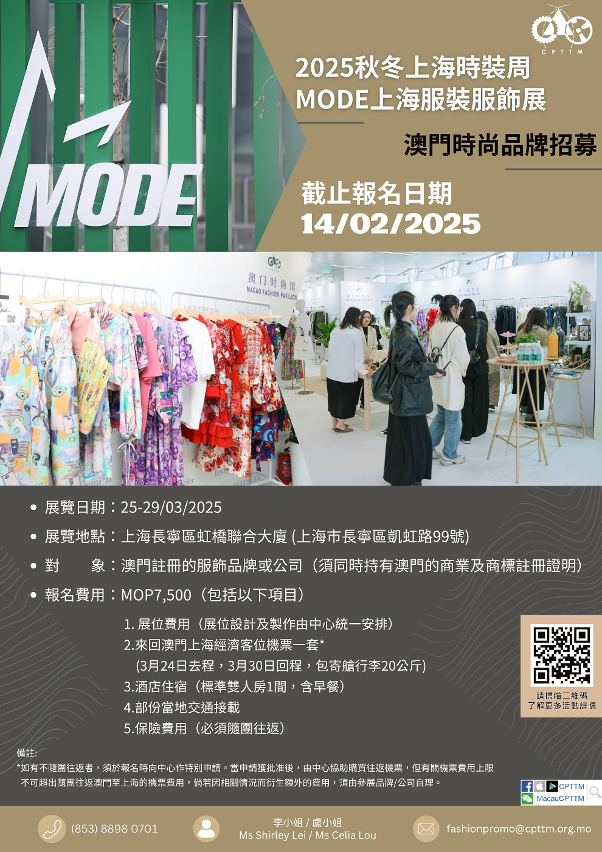 為協助澳門品牌開拓內地市場,擴濶營商網絡,澳門生產力暨科技轉移中心現招募時尚品牌參加“2025秋冬上海時裝周—MODE上海服裝服飾展”,歡迎報名參與,截止報名日期為2月14日。