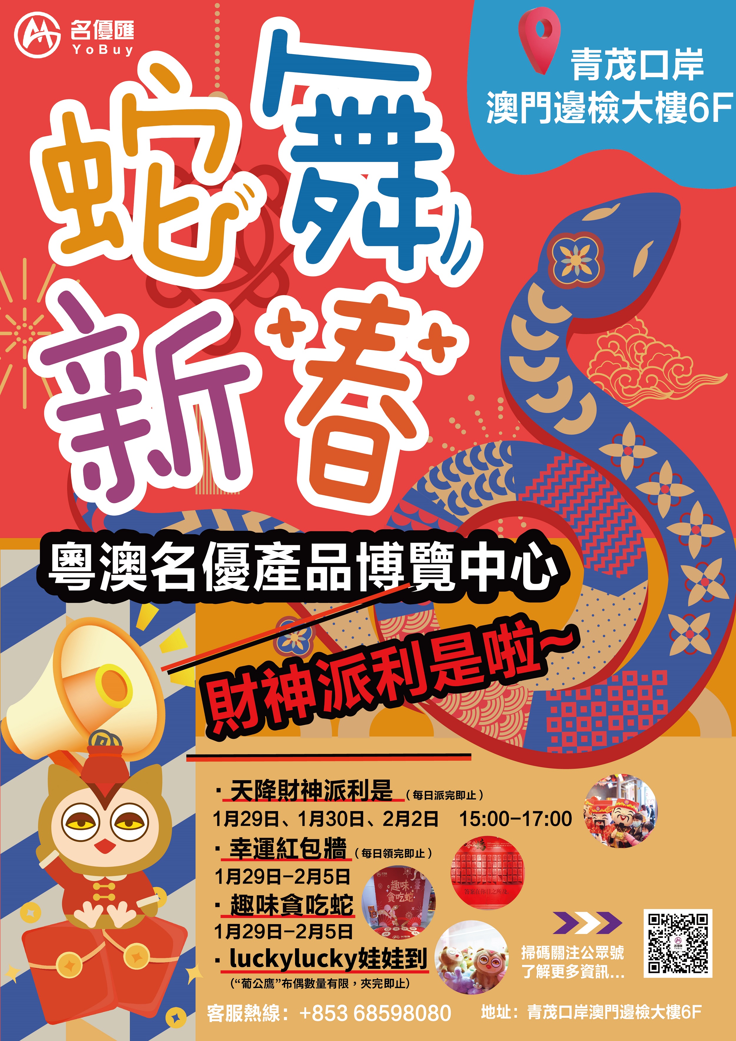 位於青茂口岸澳門邊檢大樓六樓的“粵澳名優產品博覽中心”(名優匯)自正式開業以來,為與居民及旅客共迎首個新春佳節,新春期間照常營業,適逢1月是開業滿月慶,在雙重慶典疊加下,招商投資促進局特別安排“葡公鷹”作為宣傳大使,並在新春期間“加盟”名優匯。屆時將有大型“葡公鷹”人偶與公眾近距離互動,亦可即場試試手氣“夾”走“葡公鷹”布偶,為居民及旅客營造屬於名優匯獨有的新春節慶記憶。