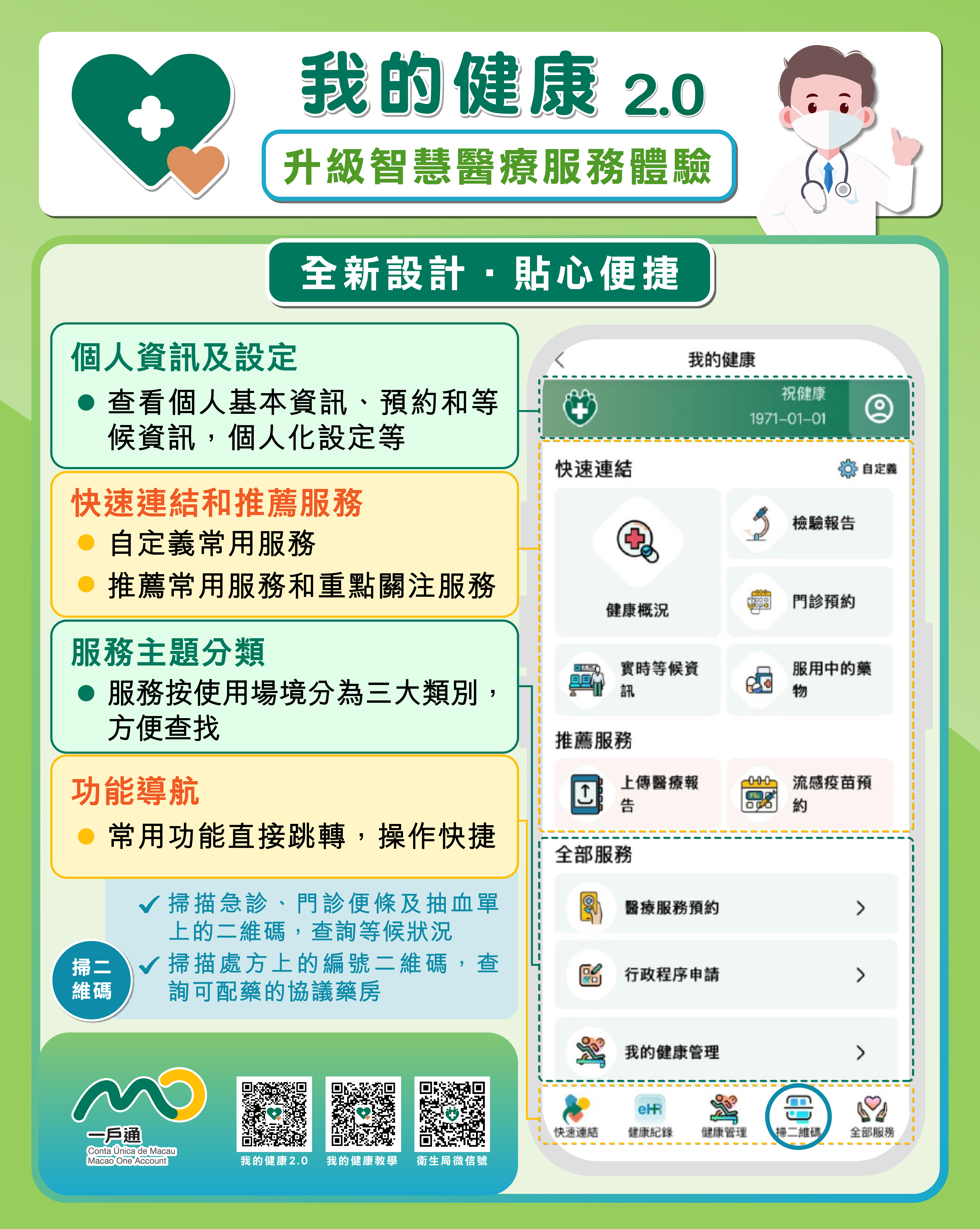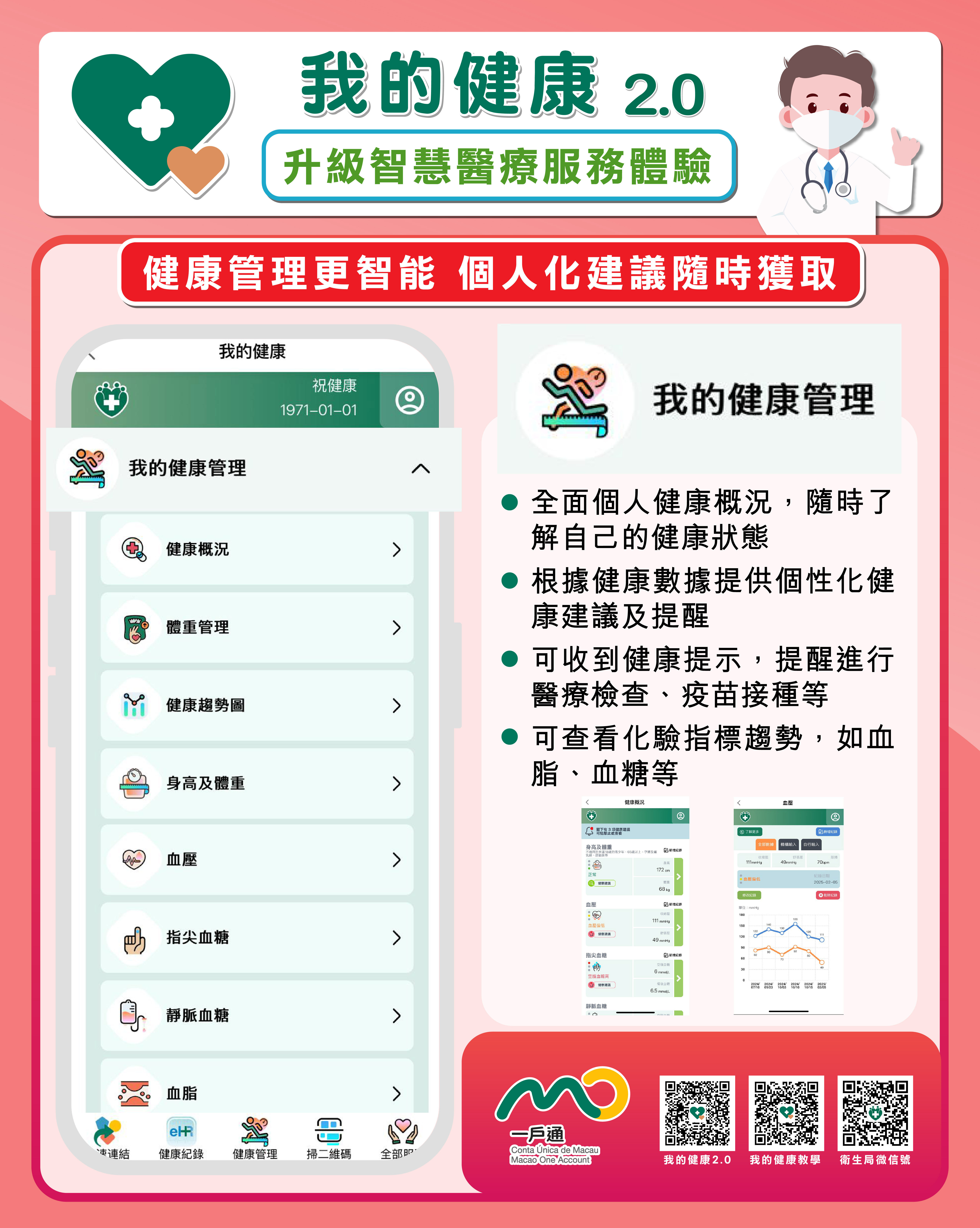 在講解會上,衛生局代表介紹了“我的健康2.0”的重點功能“健康管理”,當中包括健康概況、健康趨勢圖、體重管理等多項服務。“我的健康2.0”在使用者介面上進行了全新設計,提供快速連結和推薦服務、服務分類及功能導航等便捷服務,旨在提升用戶的操作體驗。
